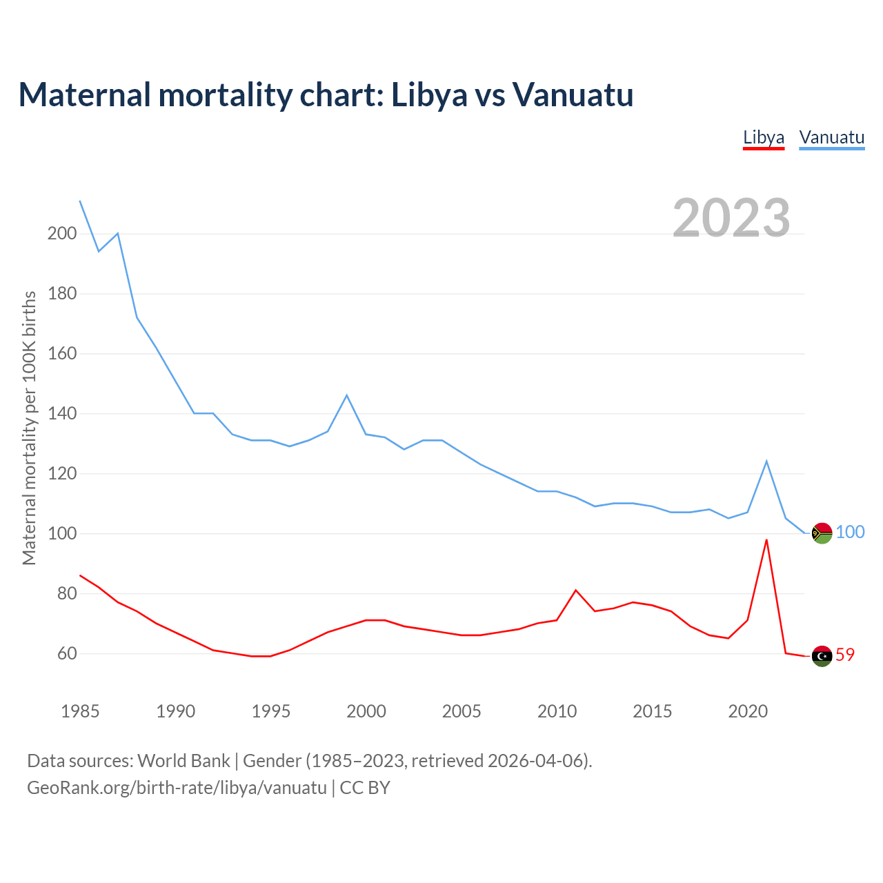 The maternal mortality rate, which is the probability of dying during childbirth or within 42 days of pregnancy termination, is 59 deaths per 100,000 live births in Libya, compared to 100 deaths in Vanuatu.