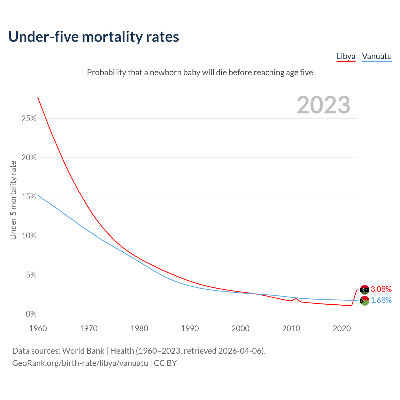 The chance that a newborn baby will die before reaching age five is 3.08% in Libya and 1.68% in Vanuatu. Above is a chart with historical data on under-five mortality rates.
