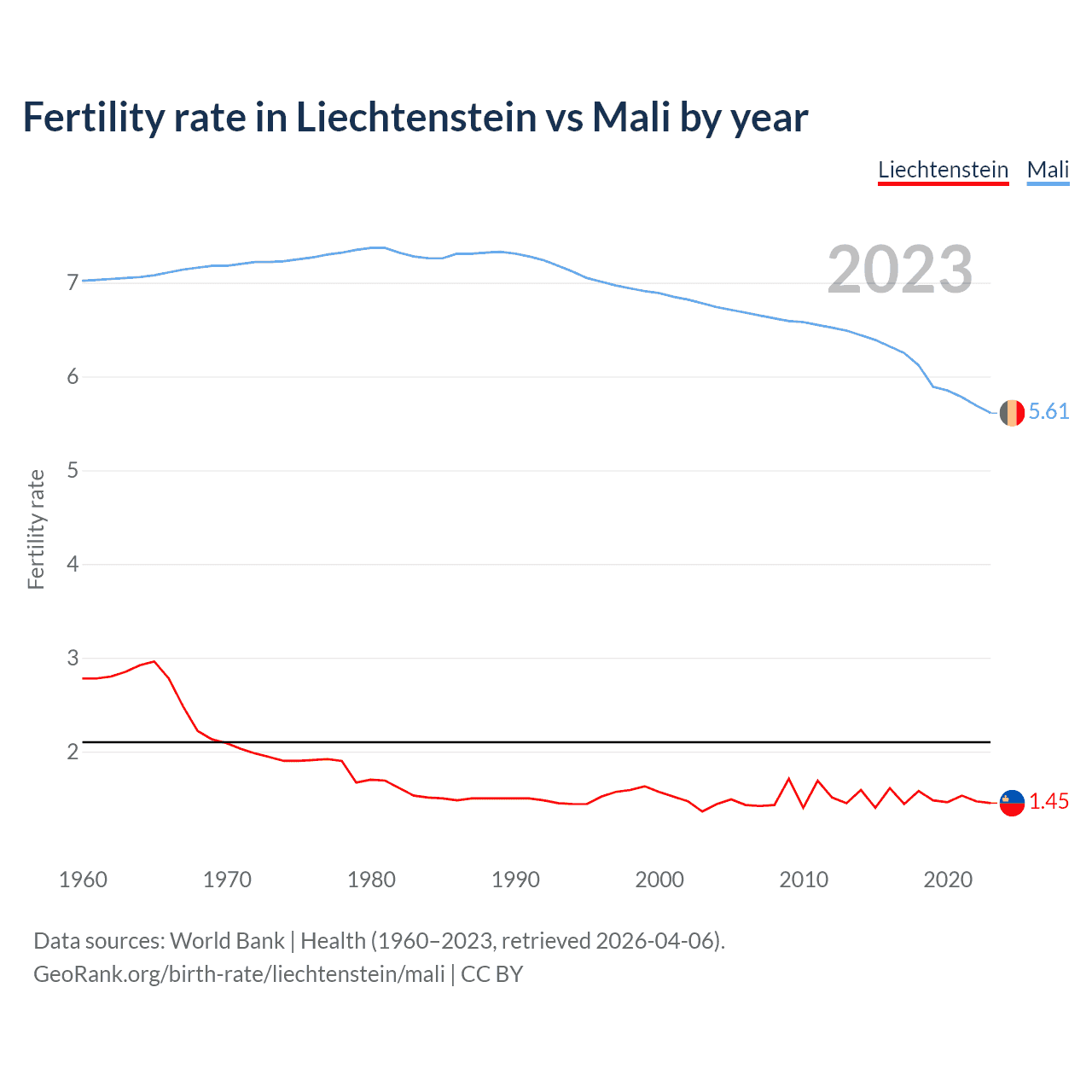 1960 vs 2023, the fertility rate has decreased by 47.8% in Liechtenstein and by 20% in Mali — in 1960, it was 2.78 and 7.02, respectively.
