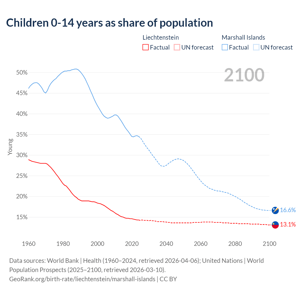 Children aged 0-14 make up 14.3% of the population in Liechtenstein and 34.5% in the Marshall Islands in 2024, compared to 19.1% and 50.2% respectively in 1990.