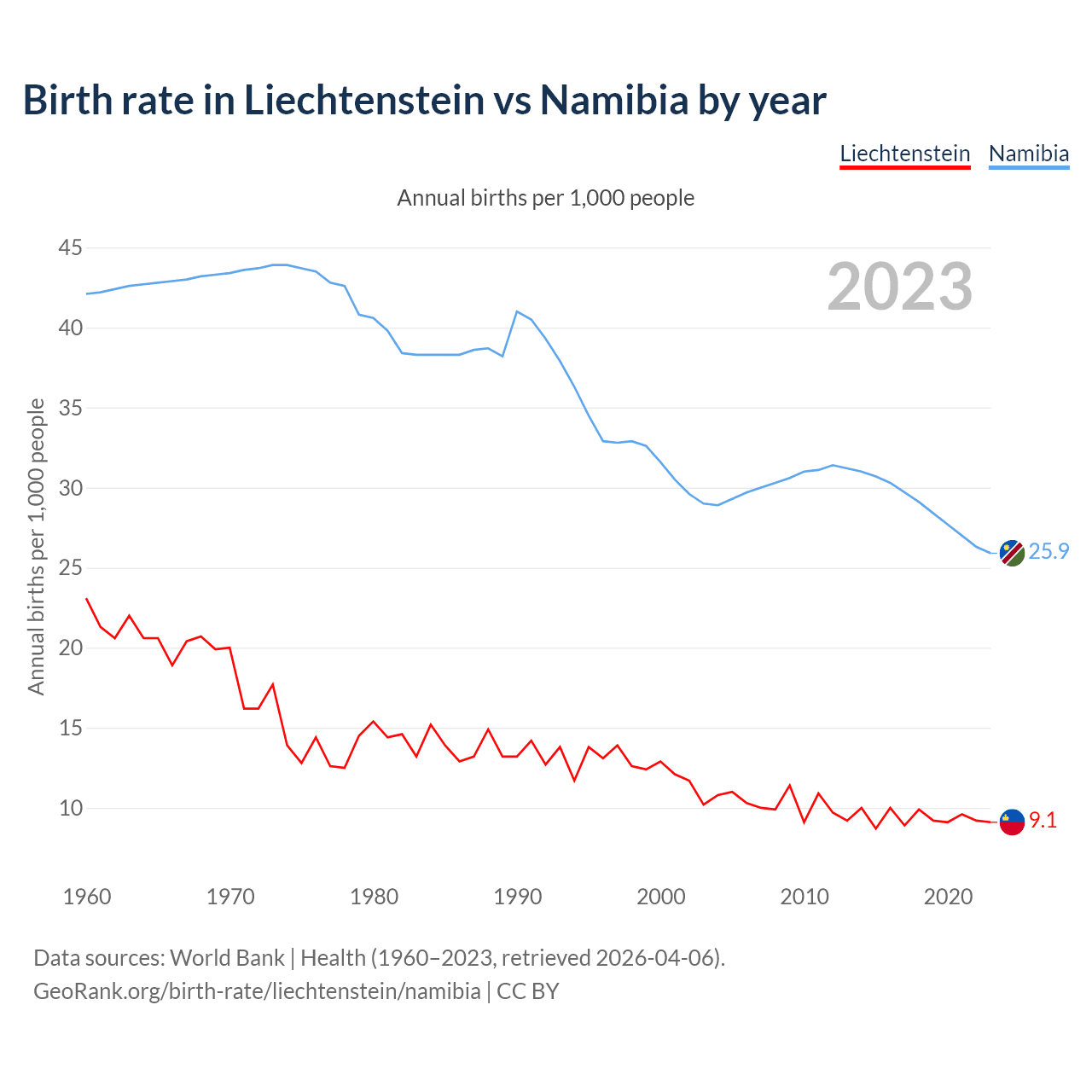 Liechtenstein has an annual birth rate of 9.1 births per 1,000 people, compared to 25.9 for Namibia. The average number of children a woman is expected to have during her lifetime — the fertility rate, is 1.45 in Liechtenstein and 3.21 in Namibia — 121.5% difference.