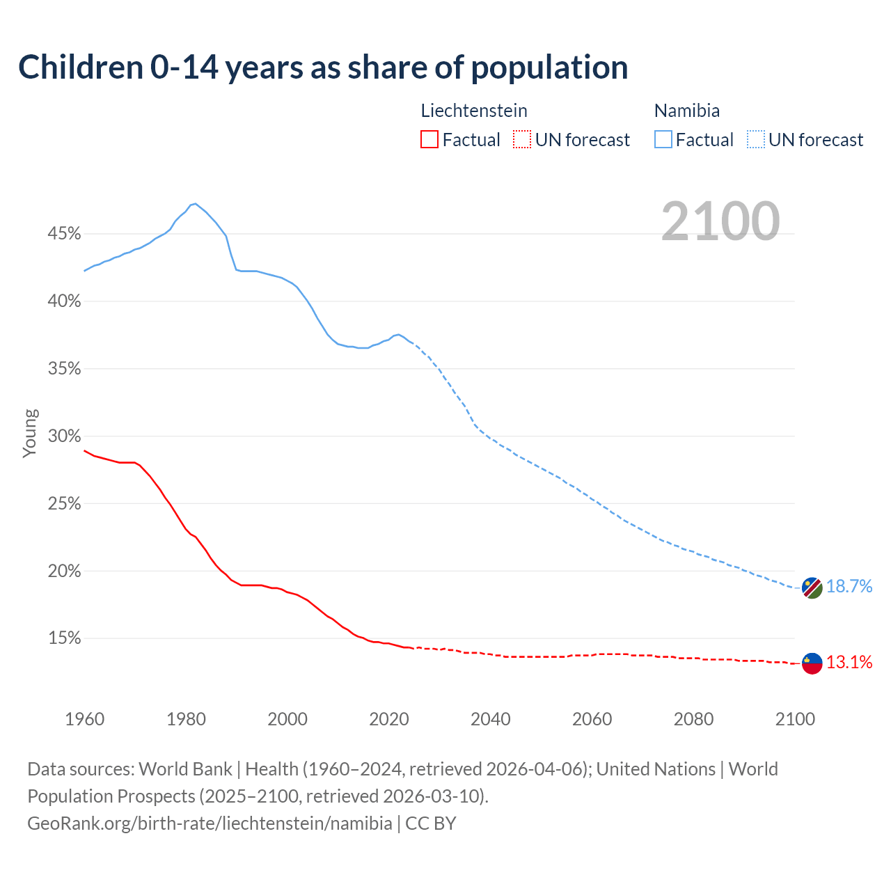 According to the latest available data on birth rates, the fertility rate in Liechtenstein was 1.45 children per woman in 2023, compared to 3.21 in Namibia in 2023. The replacement level is considered to be 2.1 children per woman.