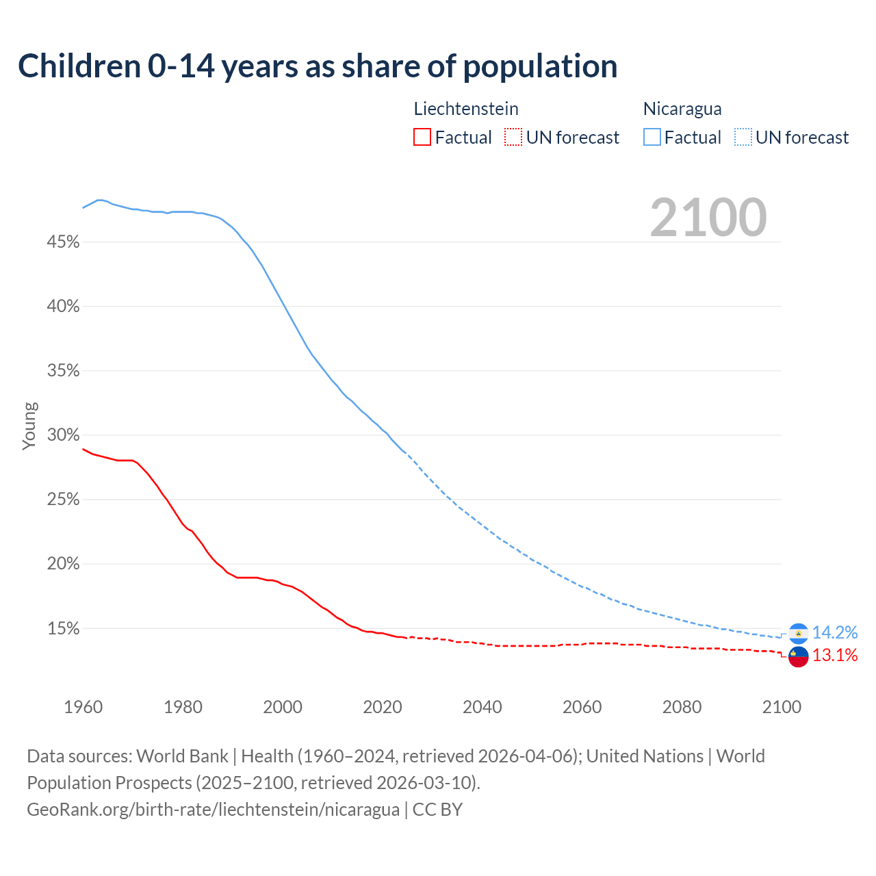 According to the latest available data on birth rates, the fertility rate in Liechtenstein was 1.45 children per woman in 2023, compared to 2.22 in Nicaragua in 2023. The replacement level is considered to be 2.1 children per woman.
