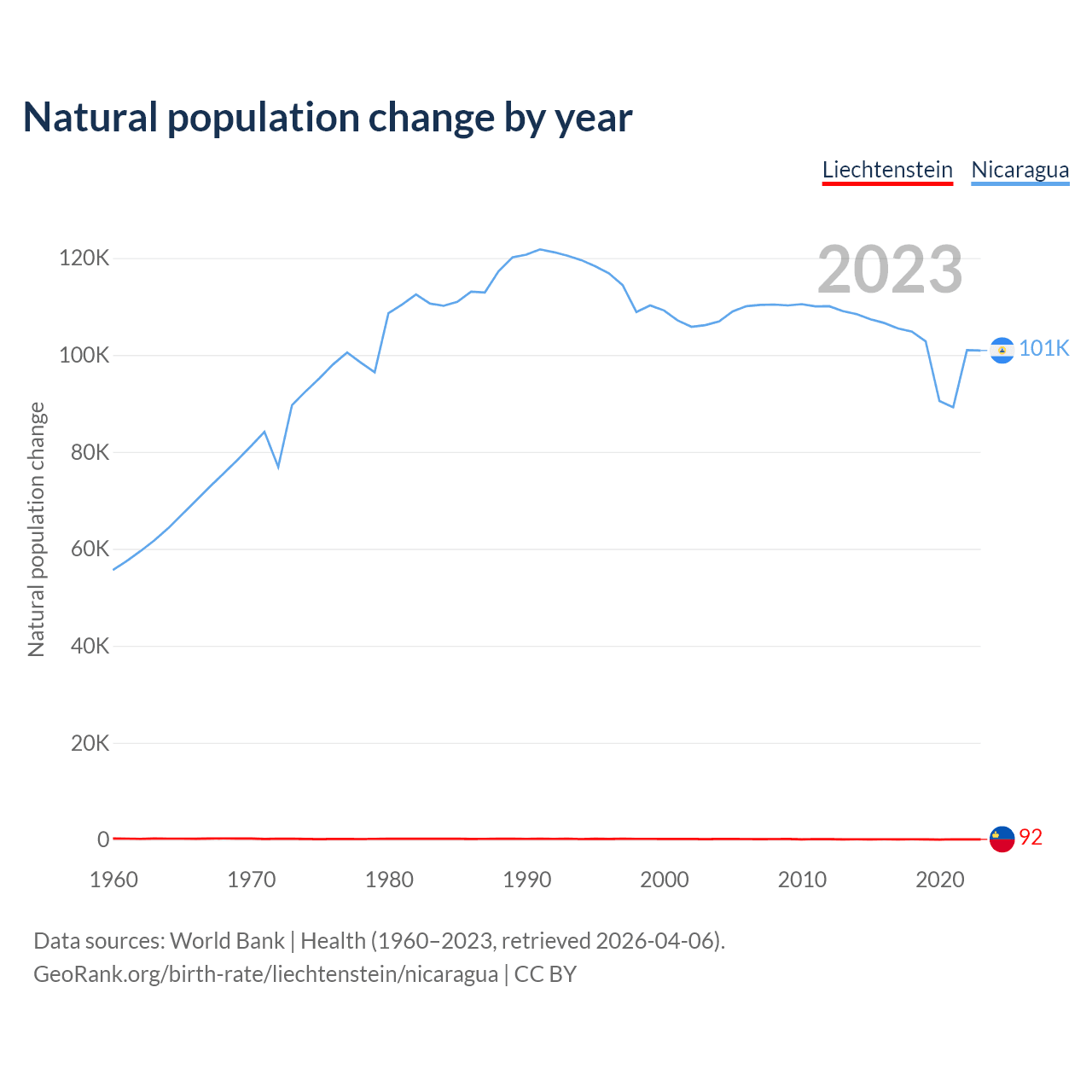 Liechtenstein has an annual birth rate of 9.1 births per 1,000 people, compared to 19.4 for Nicaragua. The average number of children a woman is expected to have during her lifetime — the fertility rate, is 1.45 in Liechtenstein and 2.22 in Nicaragua — 53% difference.