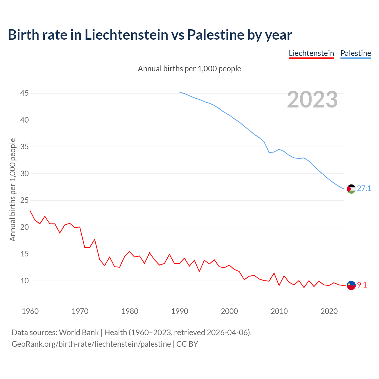 Liechtenstein has an annual birth rate of 9.1 births per 1,000 people, compared to 27.1 for Palestine. The average number of children a woman is expected to have during her lifetime — the fertility rate, is 1.45 in Liechtenstein and 3.31 in Palestine — 128.3% difference.