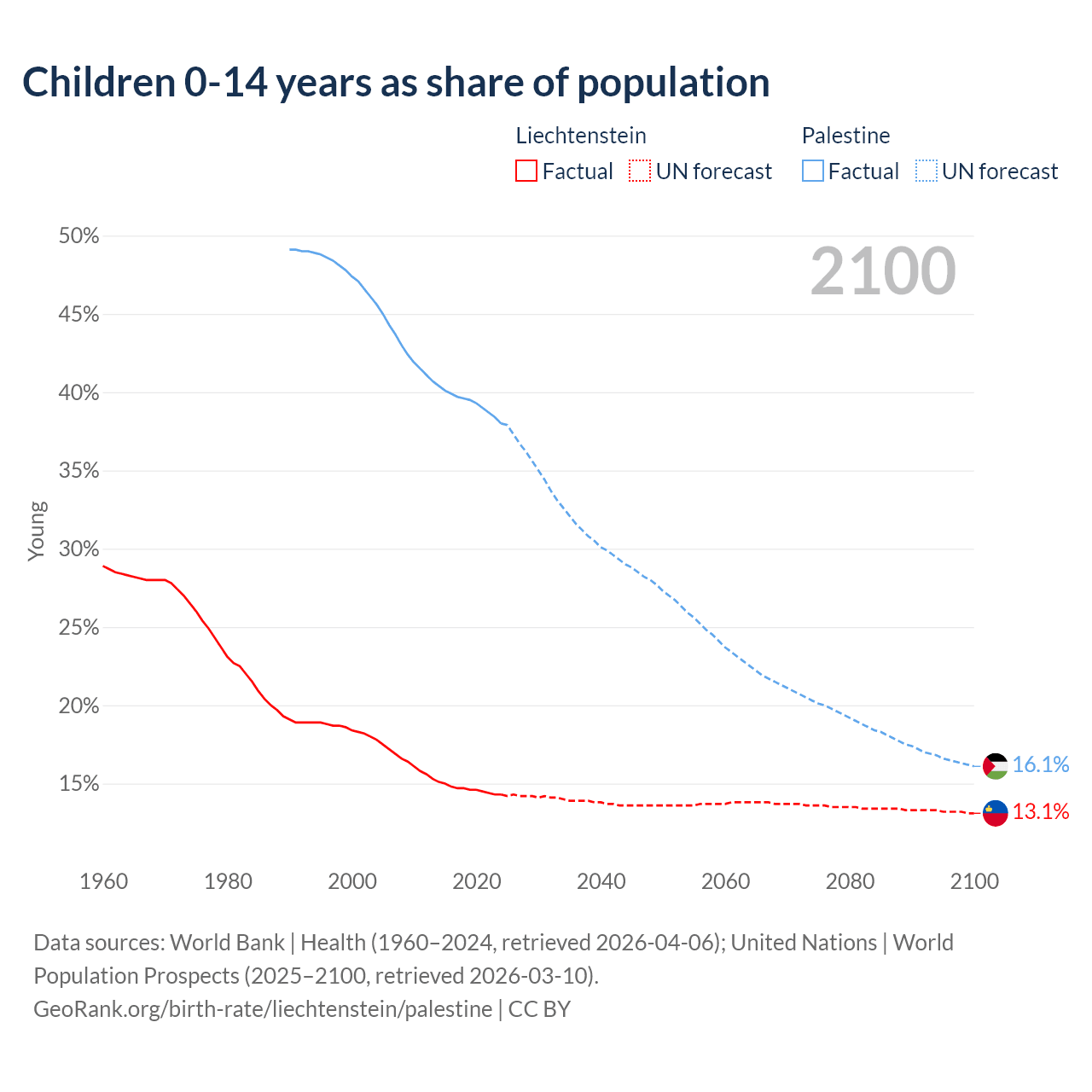 According to the latest available data on birth rates, the fertility rate in Liechtenstein was 1.45 children per woman in 2023, compared to 3.31 in Palestine in 2023. The replacement level is considered to be 2.1 children per woman.