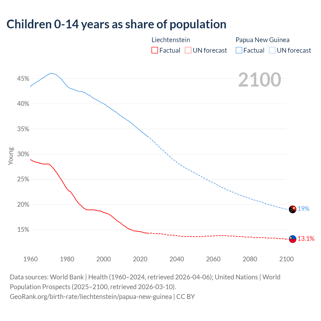 According to the latest available data on birth rates, the fertility rate in Liechtenstein was 1.45 children per woman in 2023, compared to 3.1 in Papua New Guinea in 2023. The replacement level is considered to be 2.1 children per woman.