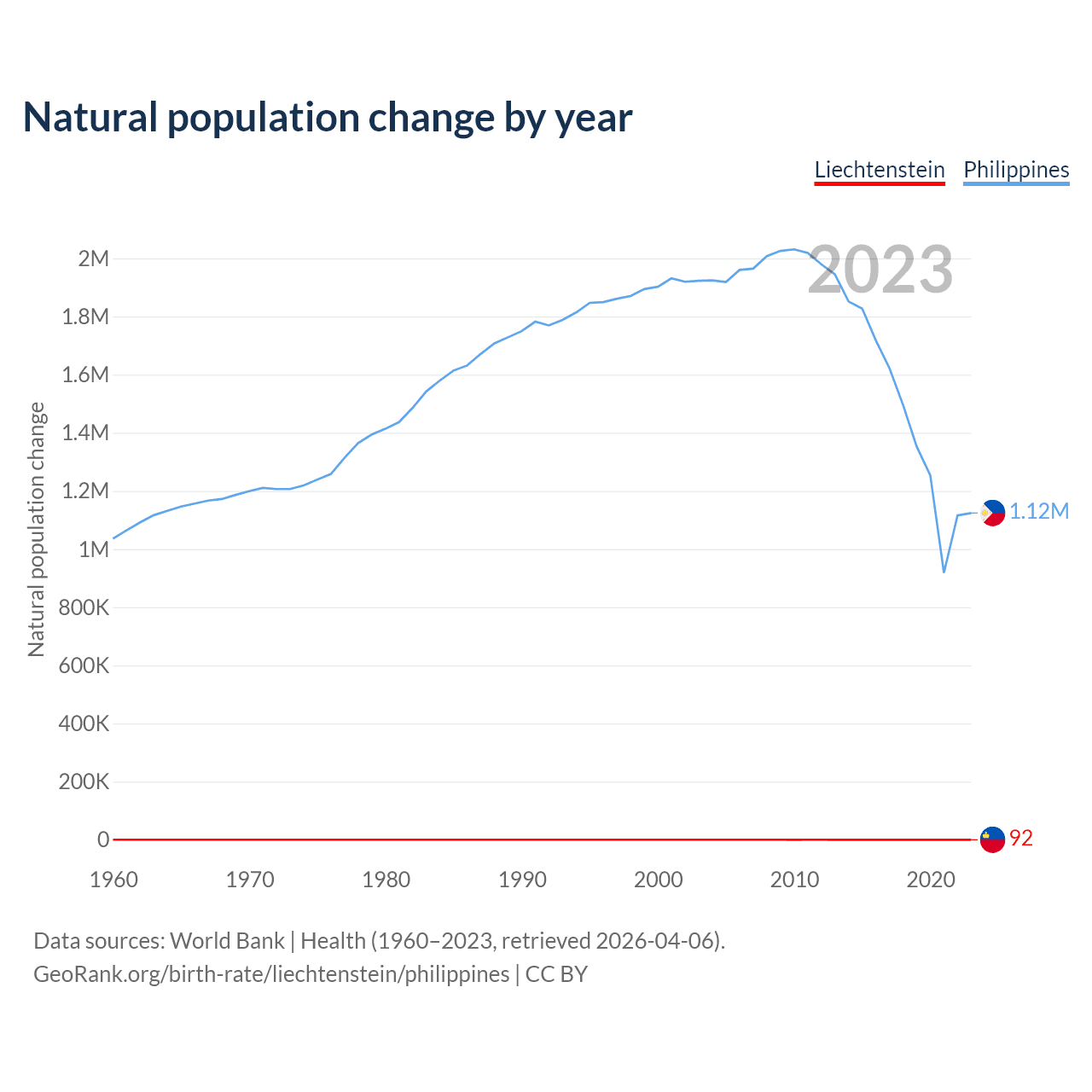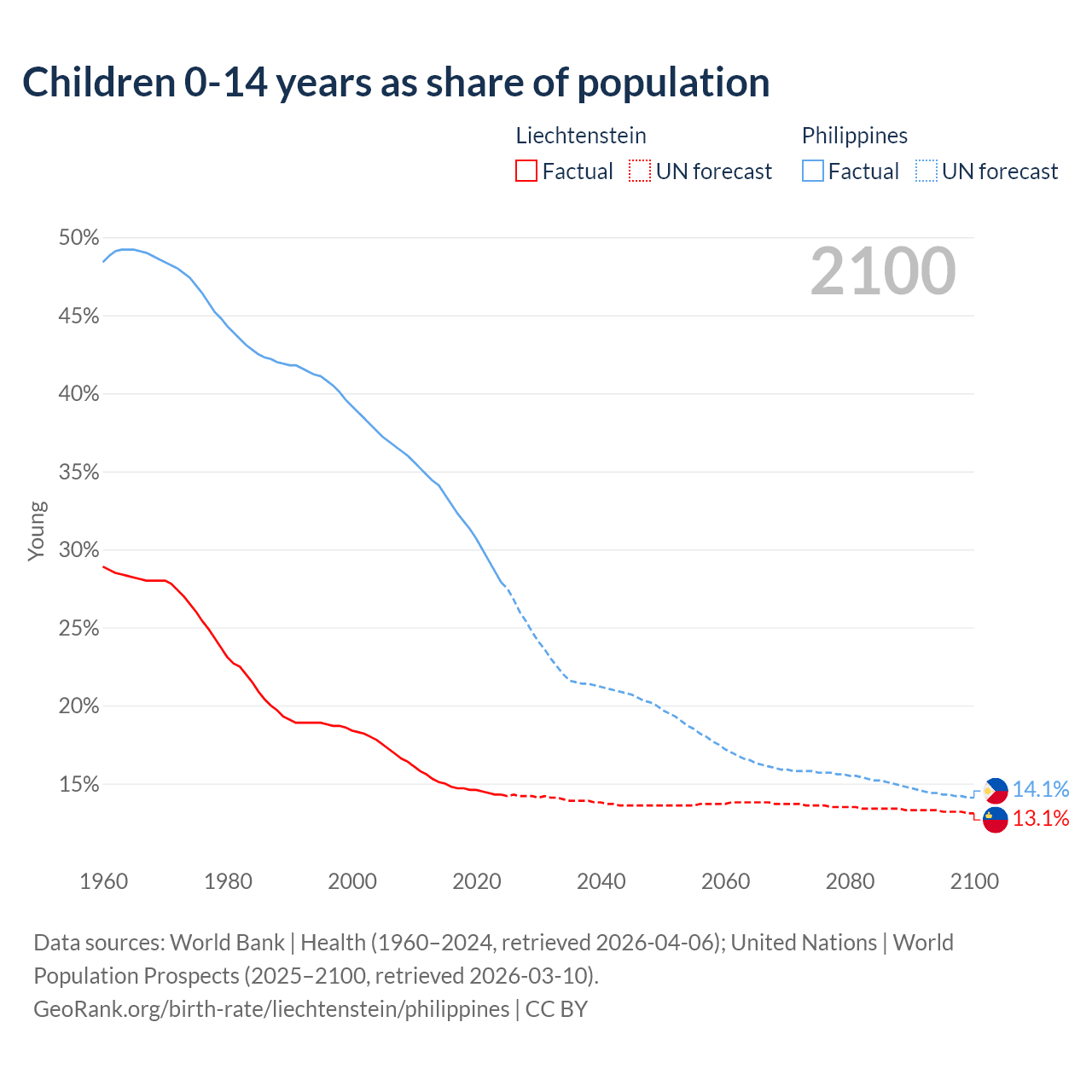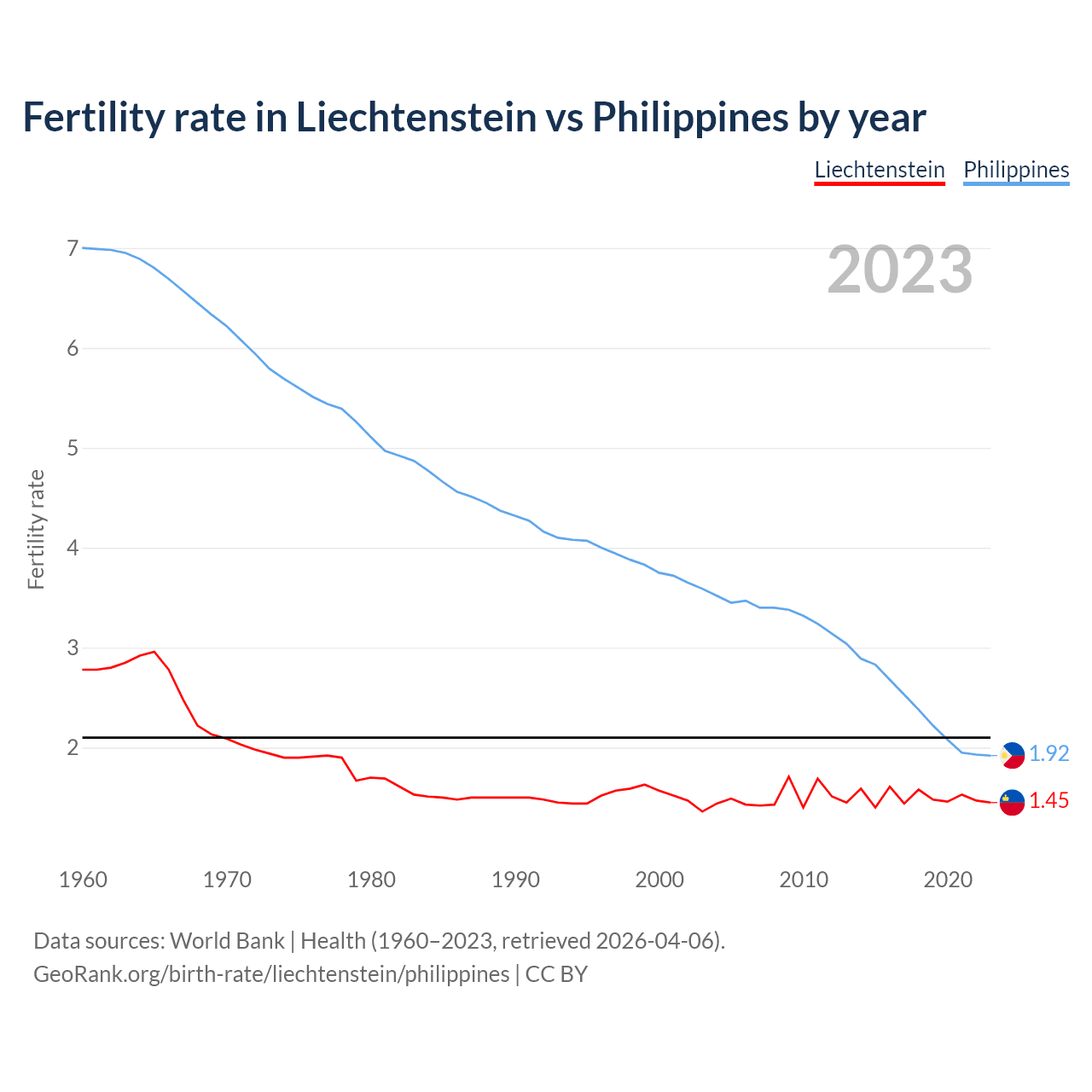 According to the latest available data on birth rates, the fertility rate in Liechtenstein was 1.45 children per woman in 2023, compared to 1.92 in the Philippines in 2023. The replacement level is considered to be 2.1 children per woman.