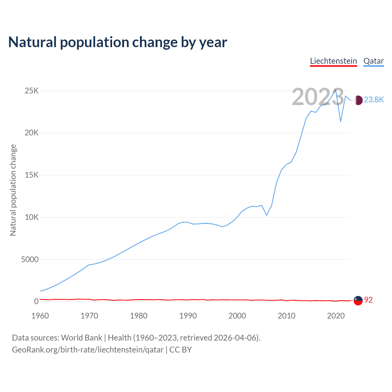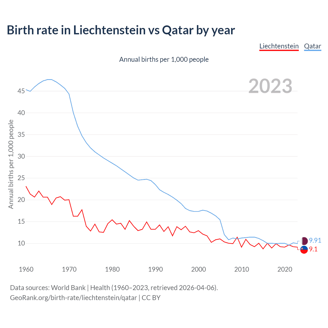 Liechtenstein has an annual birth rate of 9.1 births per 1,000 people, compared to 9.91 for Qatar. The average number of children a woman is expected to have during her lifetime — the fertility rate, is 1.45 in Liechtenstein and 1.73 in Qatar — 19.2% difference.