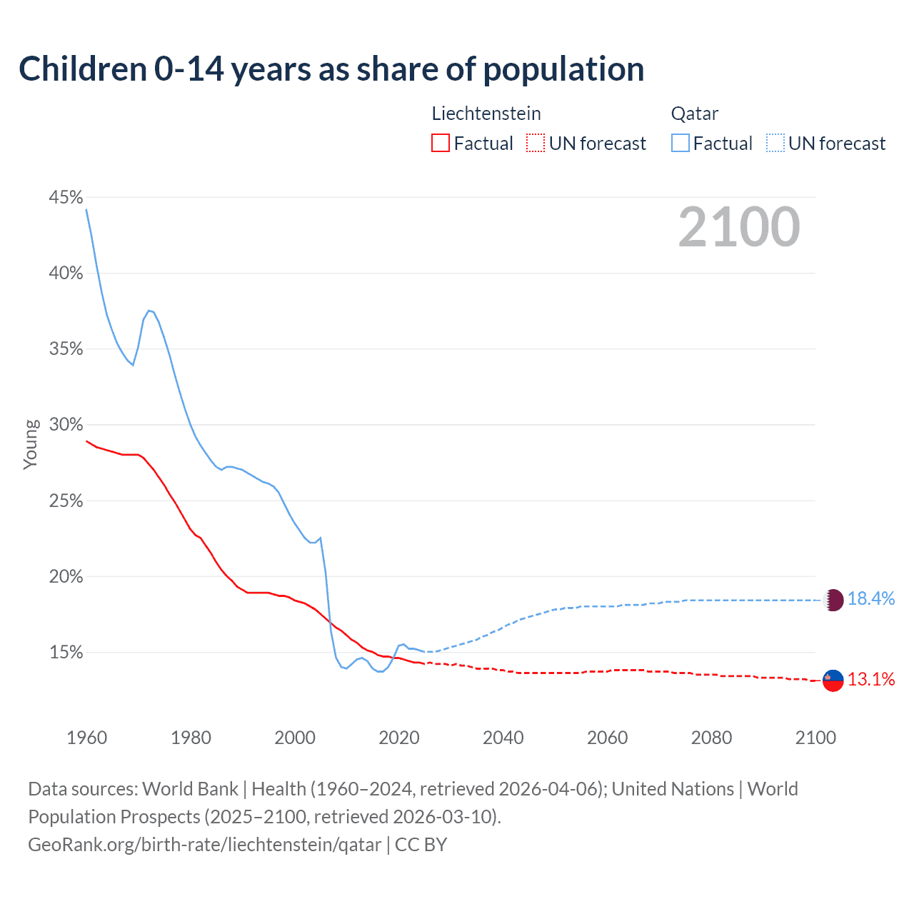 Children aged 0-14 make up 14.3% of the population in Liechtenstein and 15.1% in Qatar in 2024, compared to 19.1% and 27% respectively in 1990.