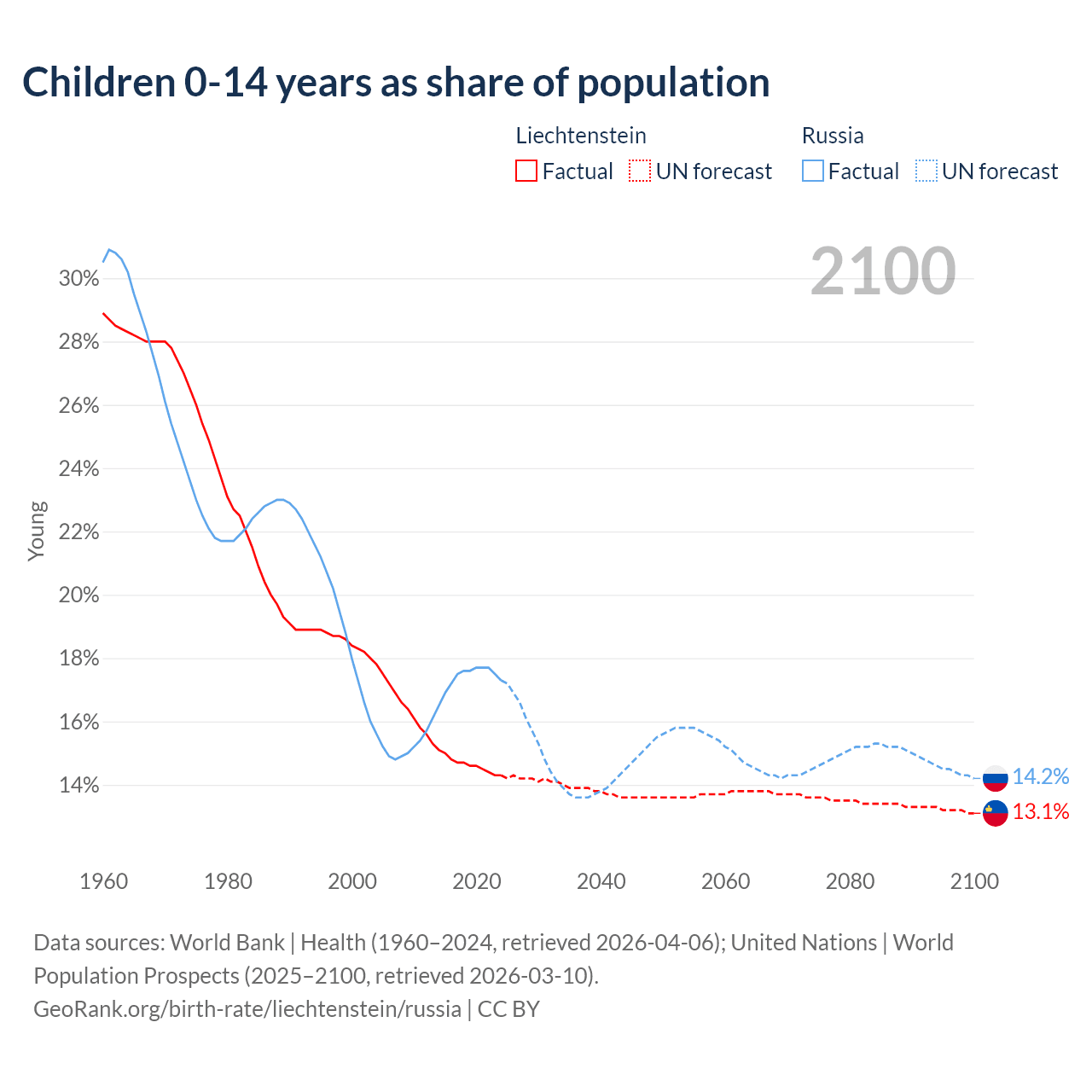 Liechtenstein has an annual birth rate of 9.1 births per 1,000 people, compared to 8.6 for Russia. The average number of children a woman is expected to have during her lifetime — the fertility rate, is 1.45 in Liechtenstein and 1.41 in Russia — 2.76% difference.