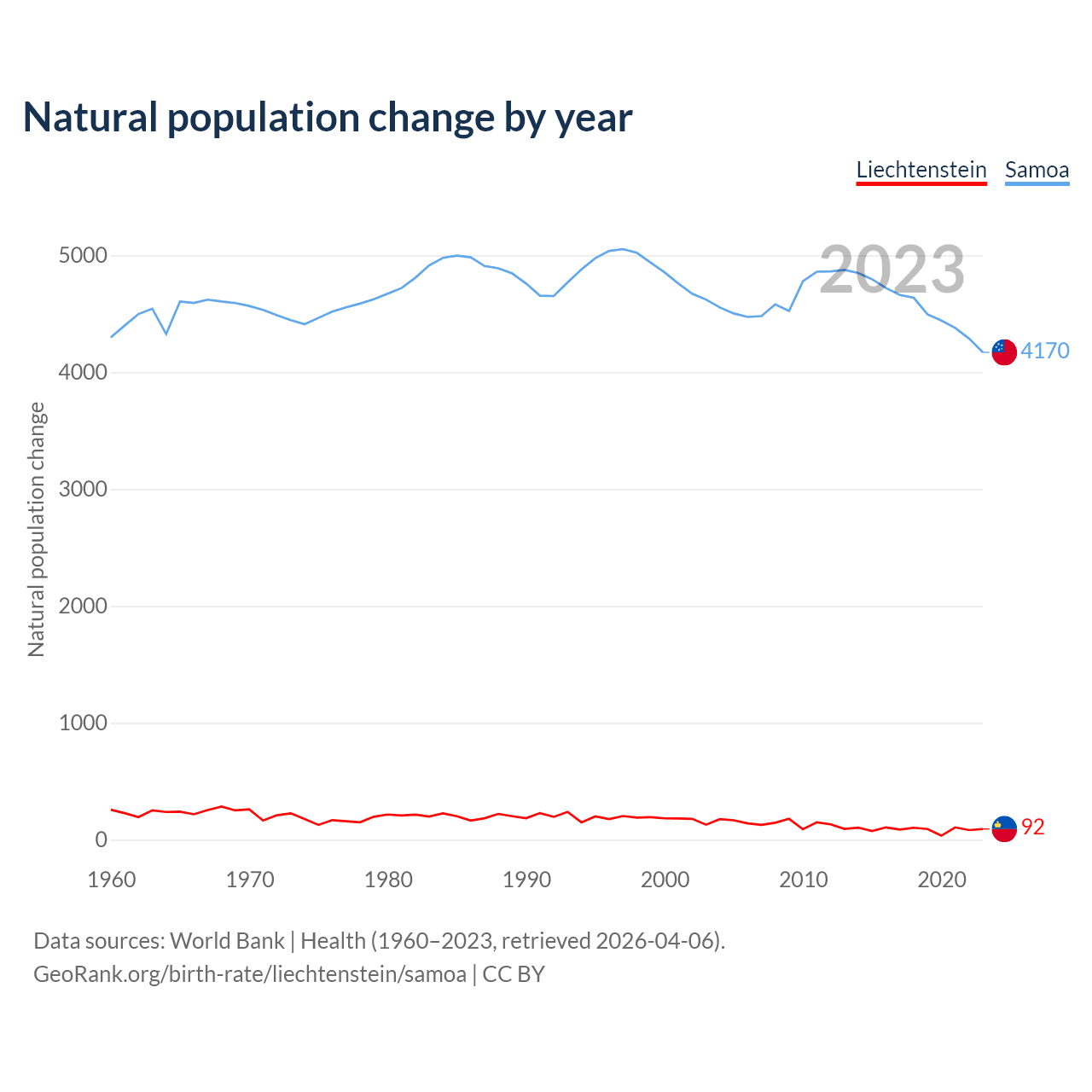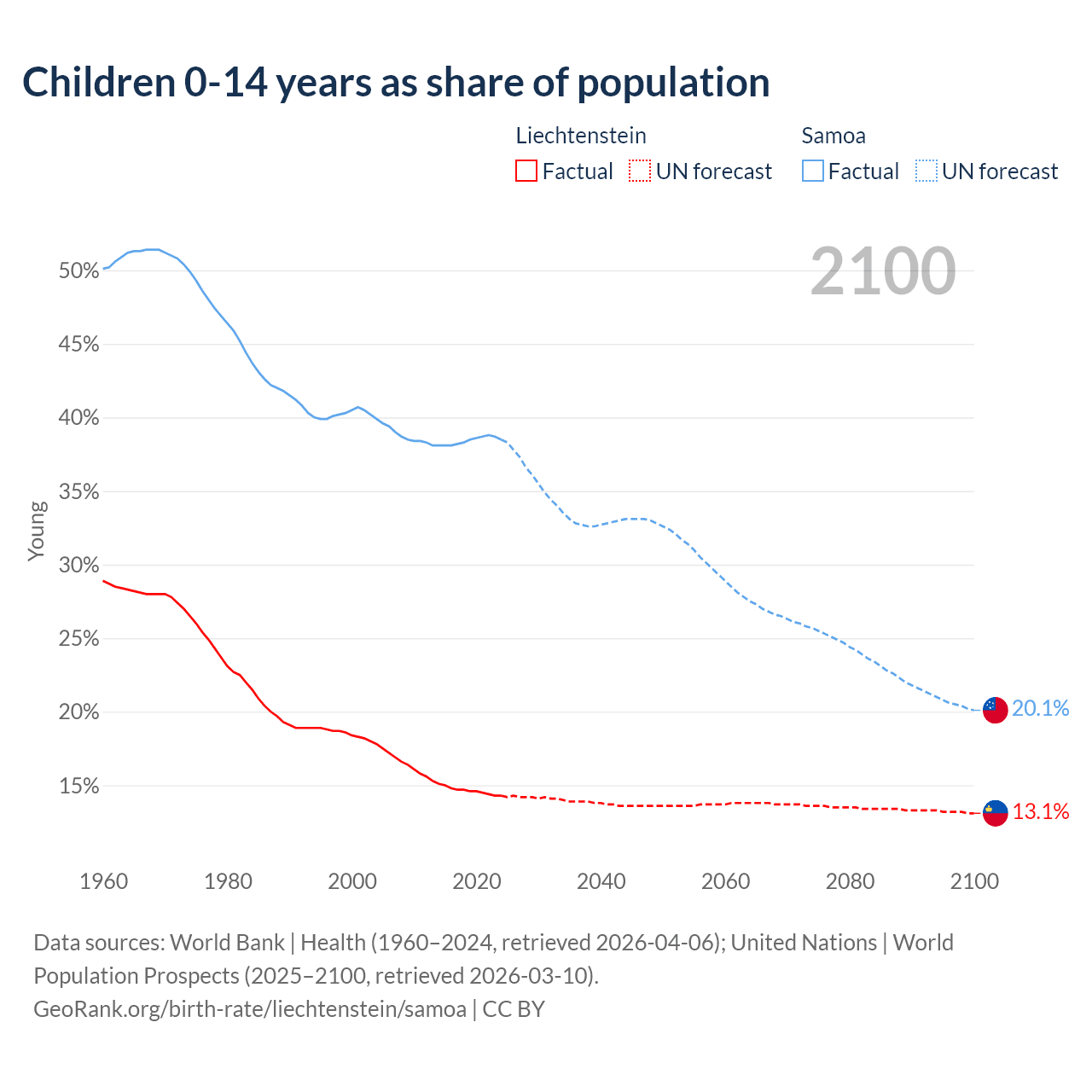 Liechtenstein has an annual birth rate of 9.1 births per 1,000 people, compared to 25.4 for Samoa. The average number of children a woman is expected to have during her lifetime — the fertility rate, is 1.45 in Liechtenstein and 3.83 in Samoa — 164.1% difference.