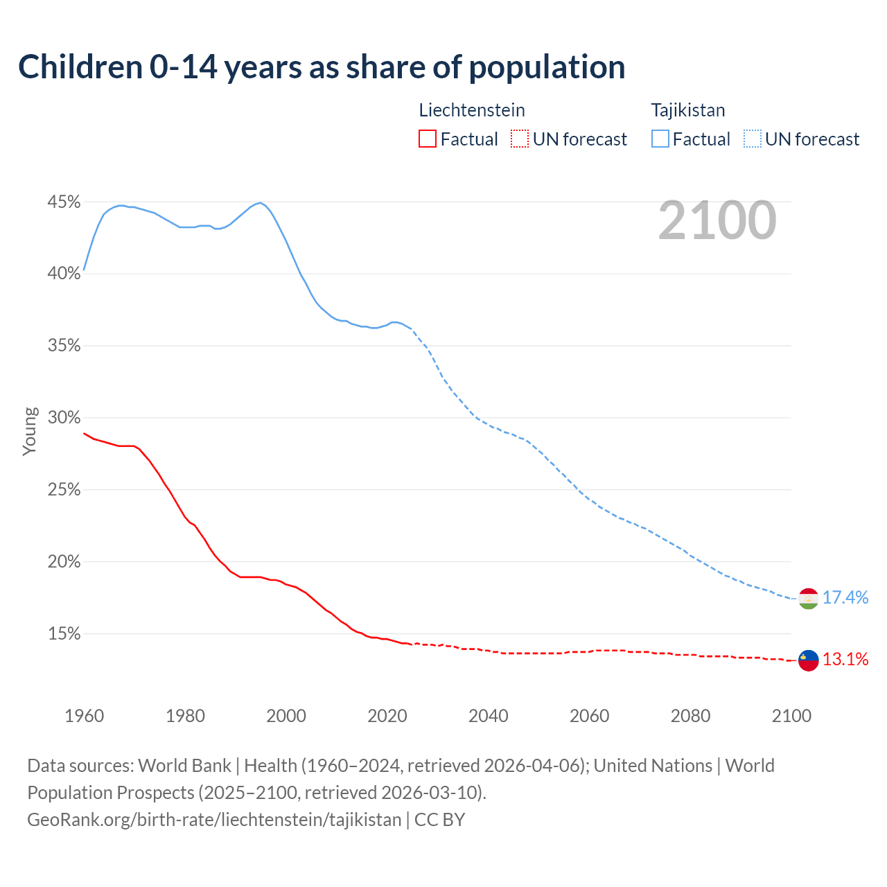 According to the latest available data on birth rates, the fertility rate in Liechtenstein was 1.45 children per woman in 2023, compared to 3.07 in Tajikistan in 2023. The replacement level is considered to be 2.1 children per woman.