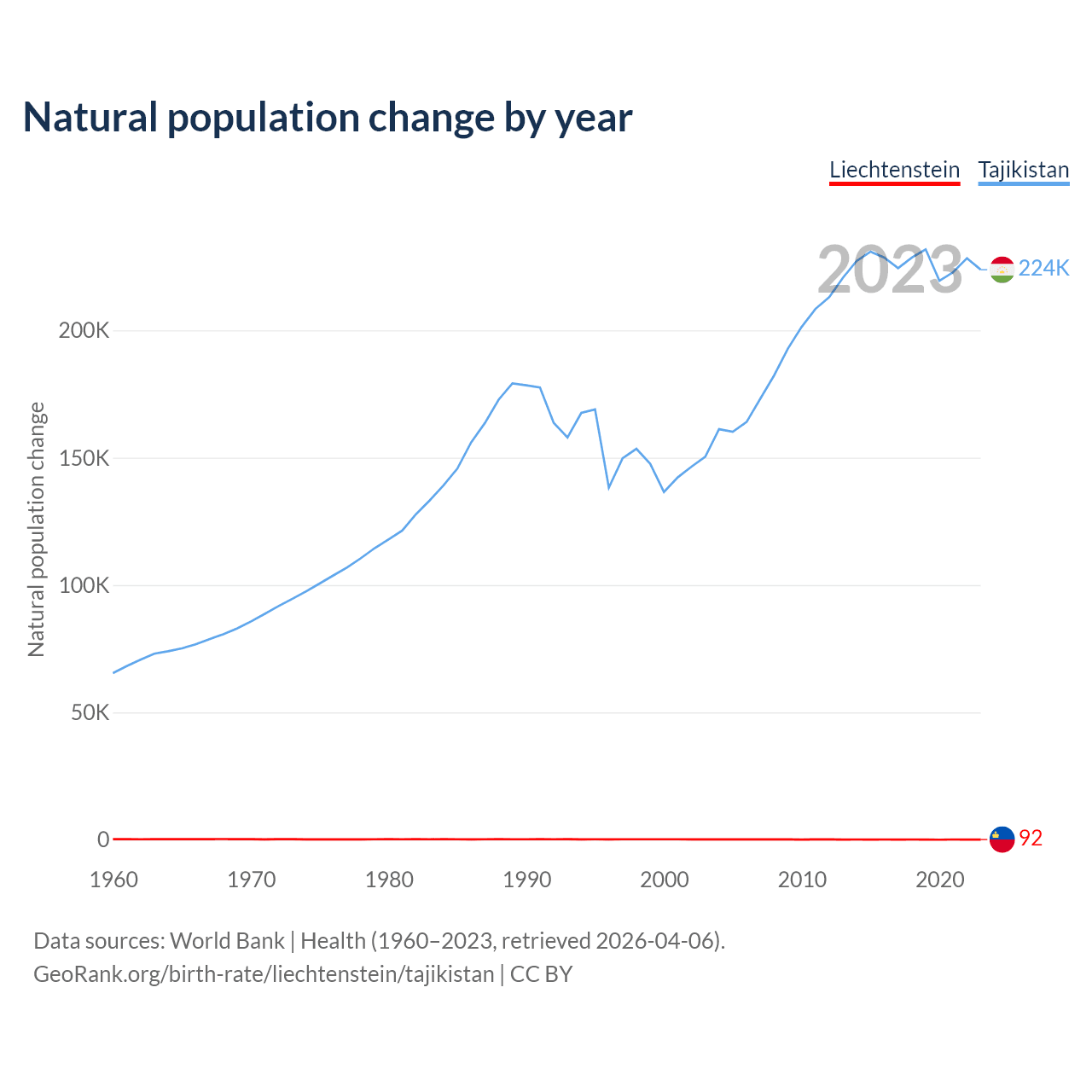 Liechtenstein has an annual birth rate of 9.1 births per 1,000 people, compared to 26.1 for Tajikistan. The average number of children a woman is expected to have during her lifetime — the fertility rate, is 1.45 in Liechtenstein and 3.07 in Tajikistan — 111.9% difference.