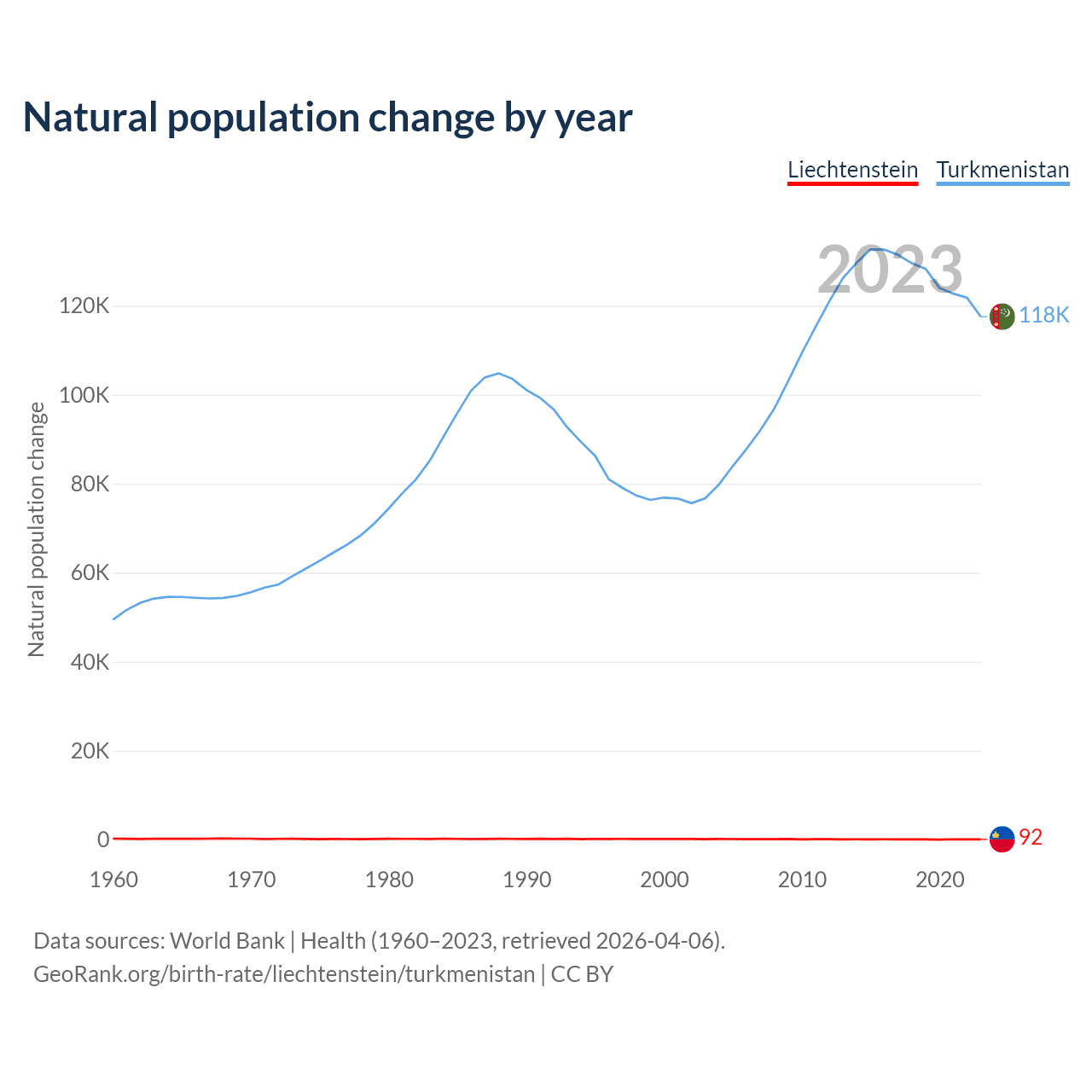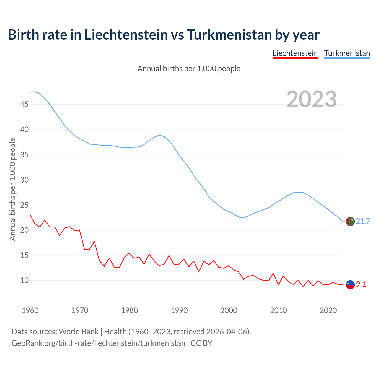 Liechtenstein has an annual birth rate of 9.1 births per 1,000 people, compared to 21.7 for Turkmenistan. The average number of children a woman is expected to have during her lifetime — the fertility rate, is 1.45 in Liechtenstein and 2.69 in Turkmenistan — 85.5% difference.