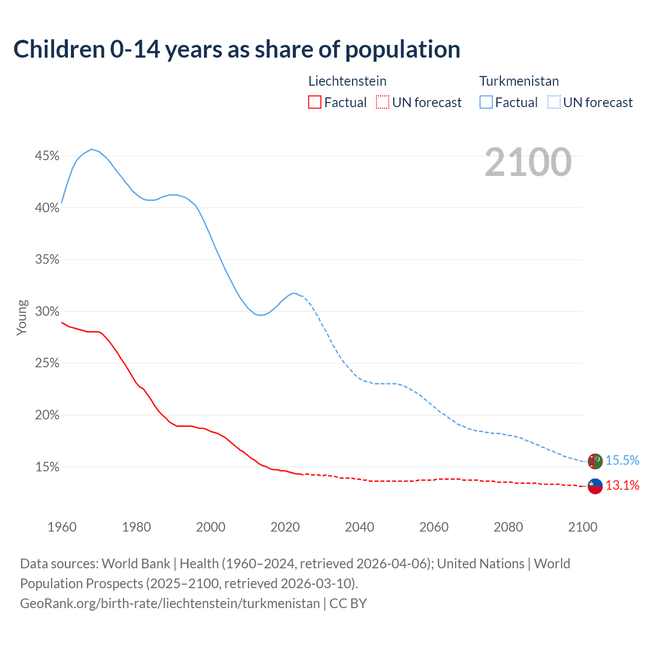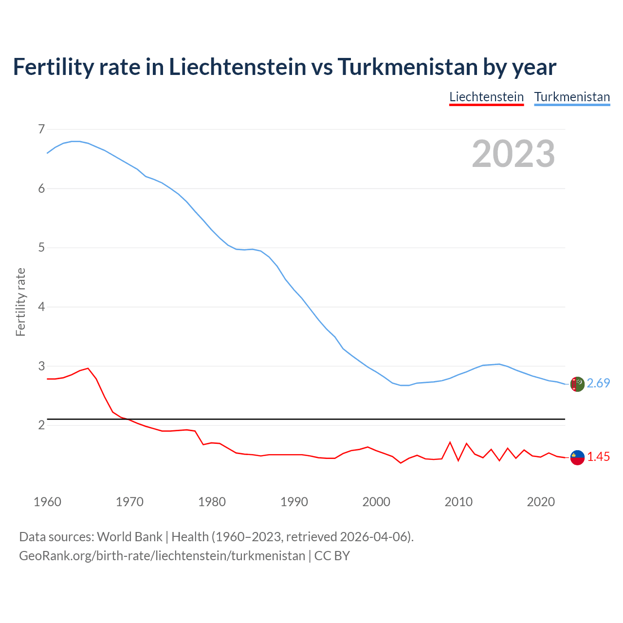 According to the latest available data on birth rates, the fertility rate in Liechtenstein was 1.45 children per woman in 2023, compared to 2.69 in Turkmenistan in 2023. The replacement level is considered to be 2.1 children per woman.