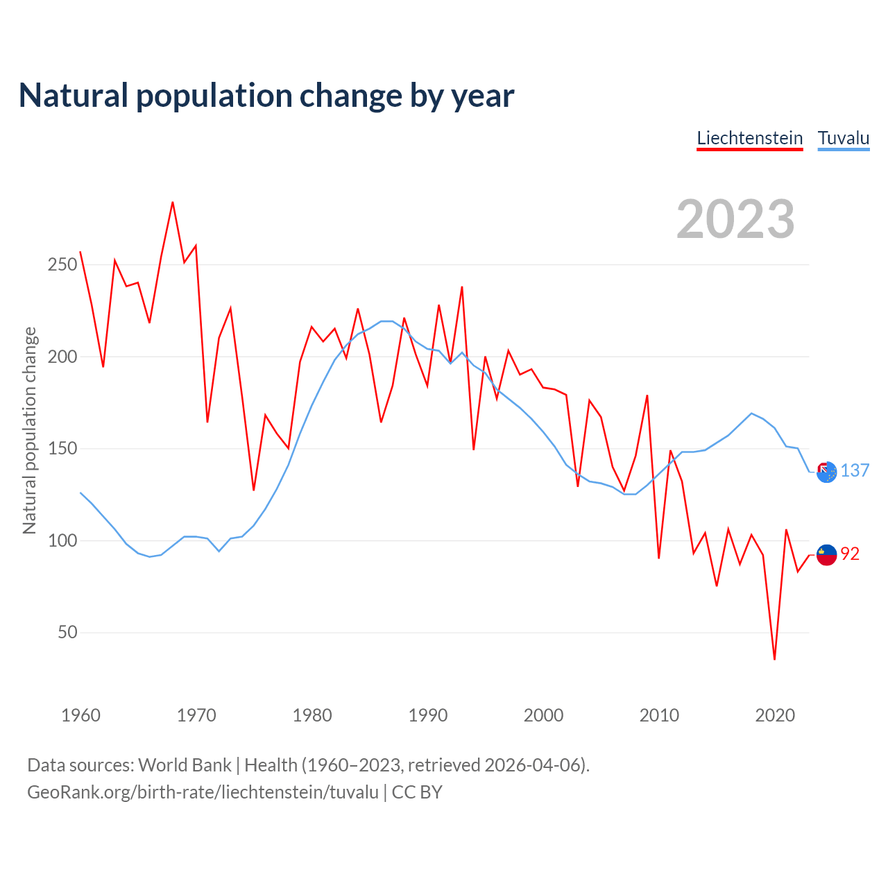 Liechtenstein has an annual birth rate of 9.1 births per 1,000 people, compared to 23.1 for Tuvalu. The average number of children a woman is expected to have during her lifetime — the fertility rate, is 1.45 in Liechtenstein and 3.21 in Tuvalu — 121.2% difference.