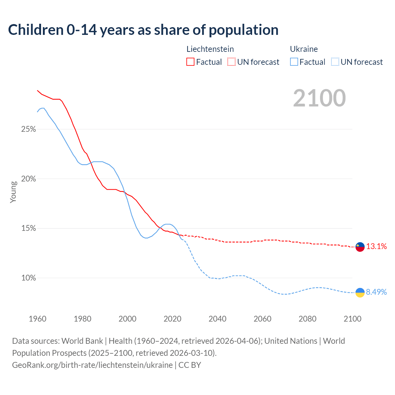 Liechtenstein has an annual birth rate of 9.1 births per 1,000 people, compared to 5.63 for Ukraine. The average number of children a woman is expected to have during her lifetime — the fertility rate, is 1.45 in Liechtenstein and 0.98 in Ukraine — 32.6% difference.