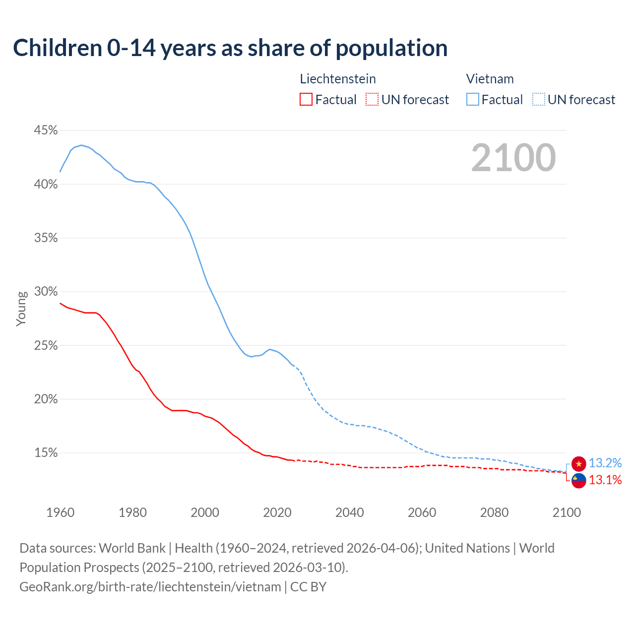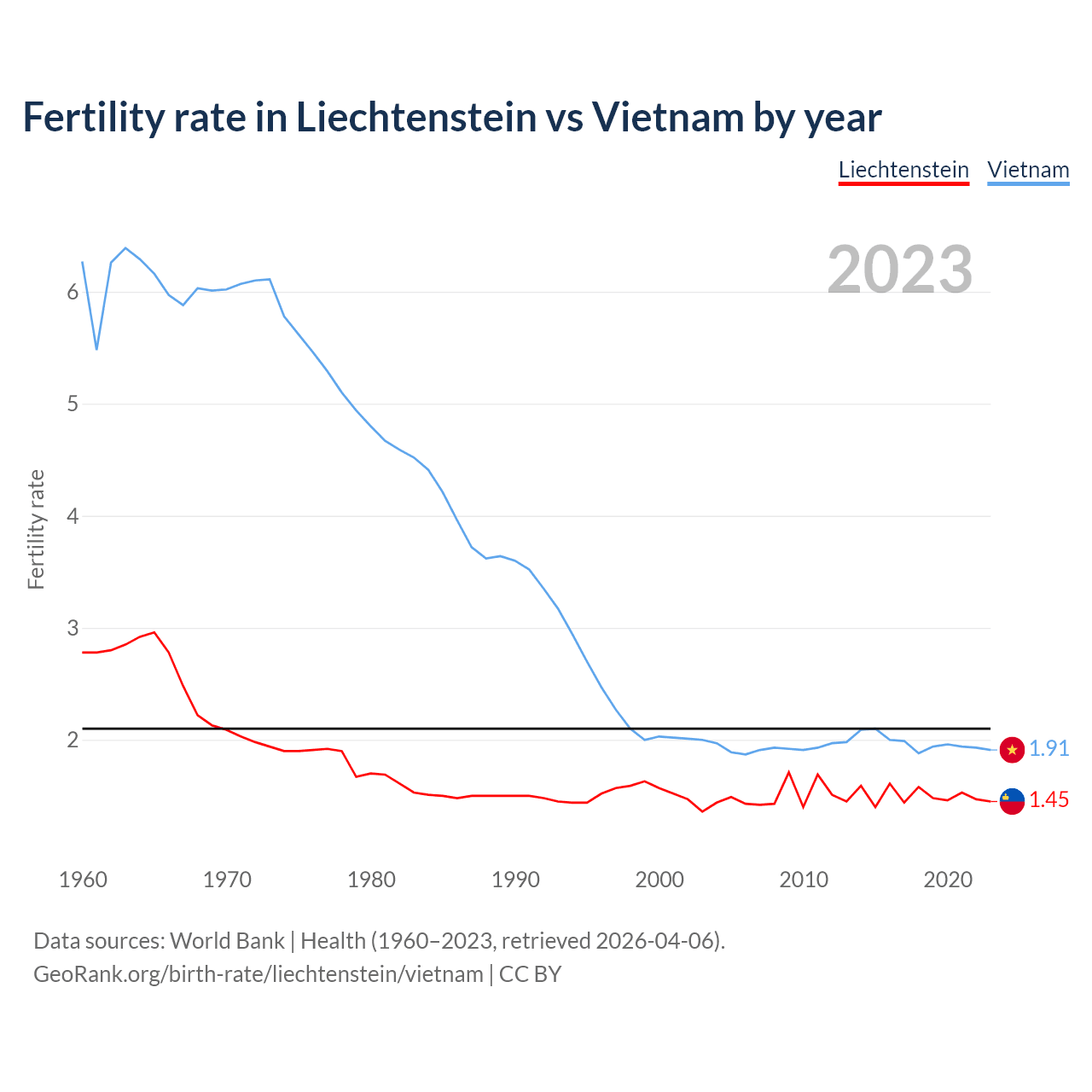 According to the latest available data on birth rates, the fertility rate in Liechtenstein was 1.45 children per woman in 2023, compared to 1.91 in Vietnam in 2023. The replacement level is considered to be 2.1 children per woman.