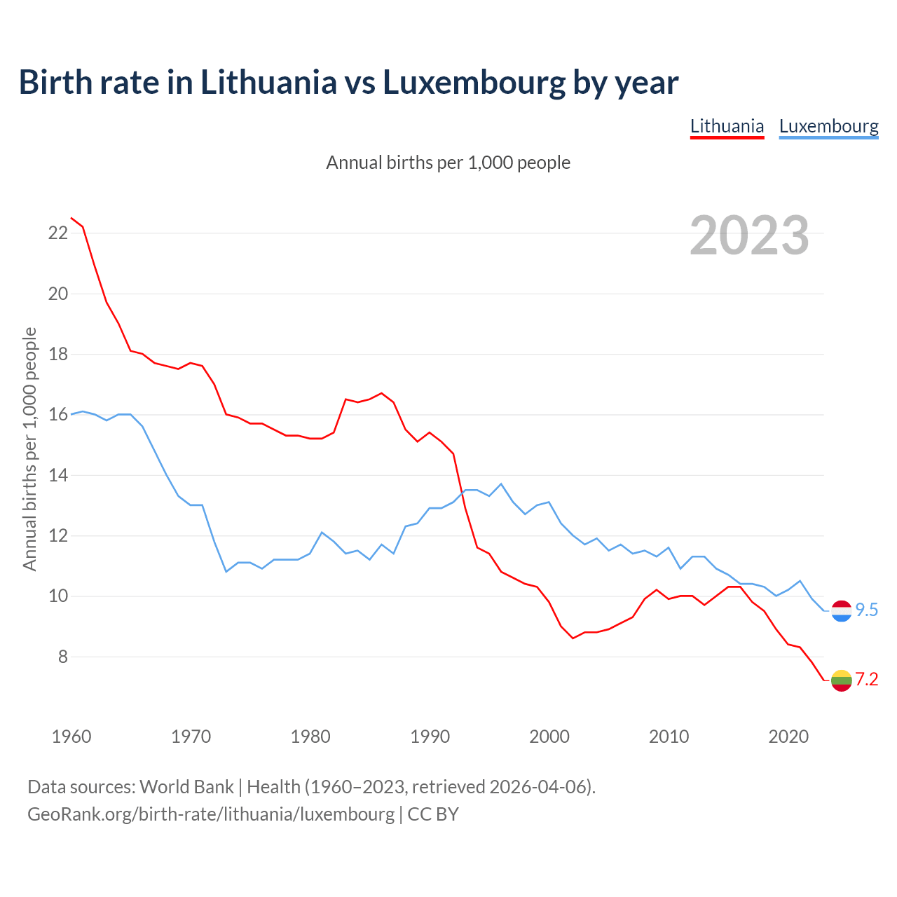 Lithuania has an annual birth rate of 7.2 births per 1,000 people, compared to 9.5 for Luxembourg. The average number of children a woman is expected to have during her lifetime — the fertility rate, is 1.18 in Lithuania and 1.25 in Luxembourg — 5.93% difference.