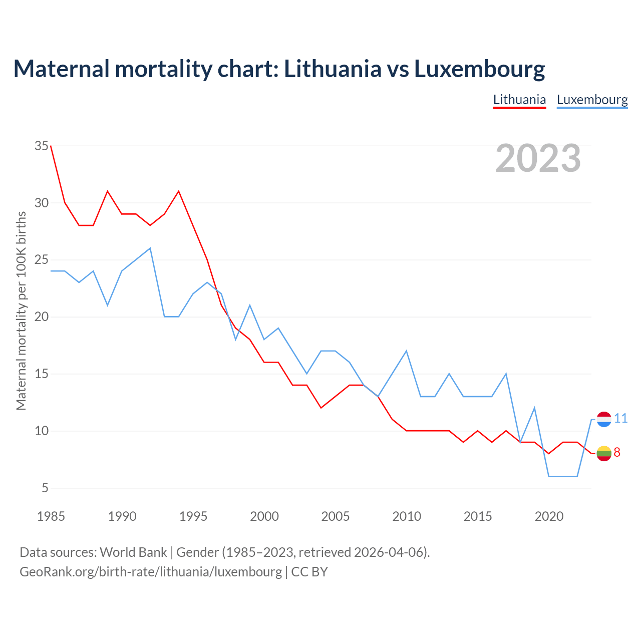 The maternal mortality rate, which is the probability of dying during childbirth or within 42 days of pregnancy termination, is 8 deaths per 100,000 live births in Lithuania, compared to 11 deaths in Luxembourg.
