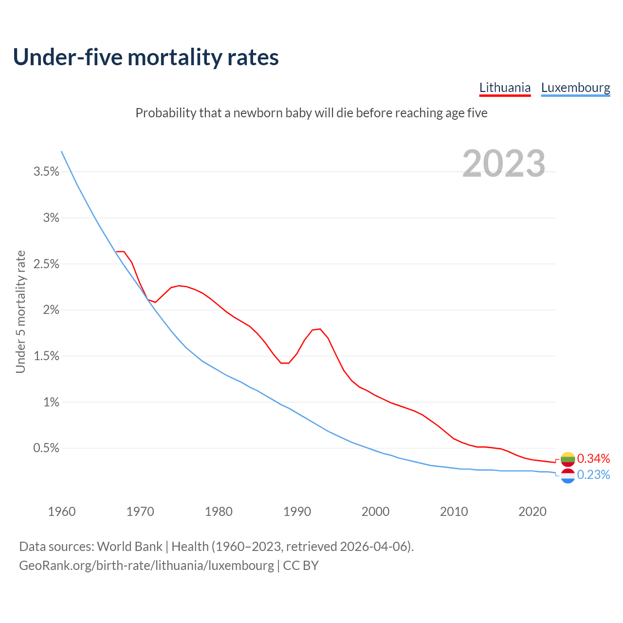The chance that a newborn baby will die before reaching age five is 0.34% in Lithuania and 0.23% in Luxembourg. Above is a chart with historical data on under-five mortality rates.