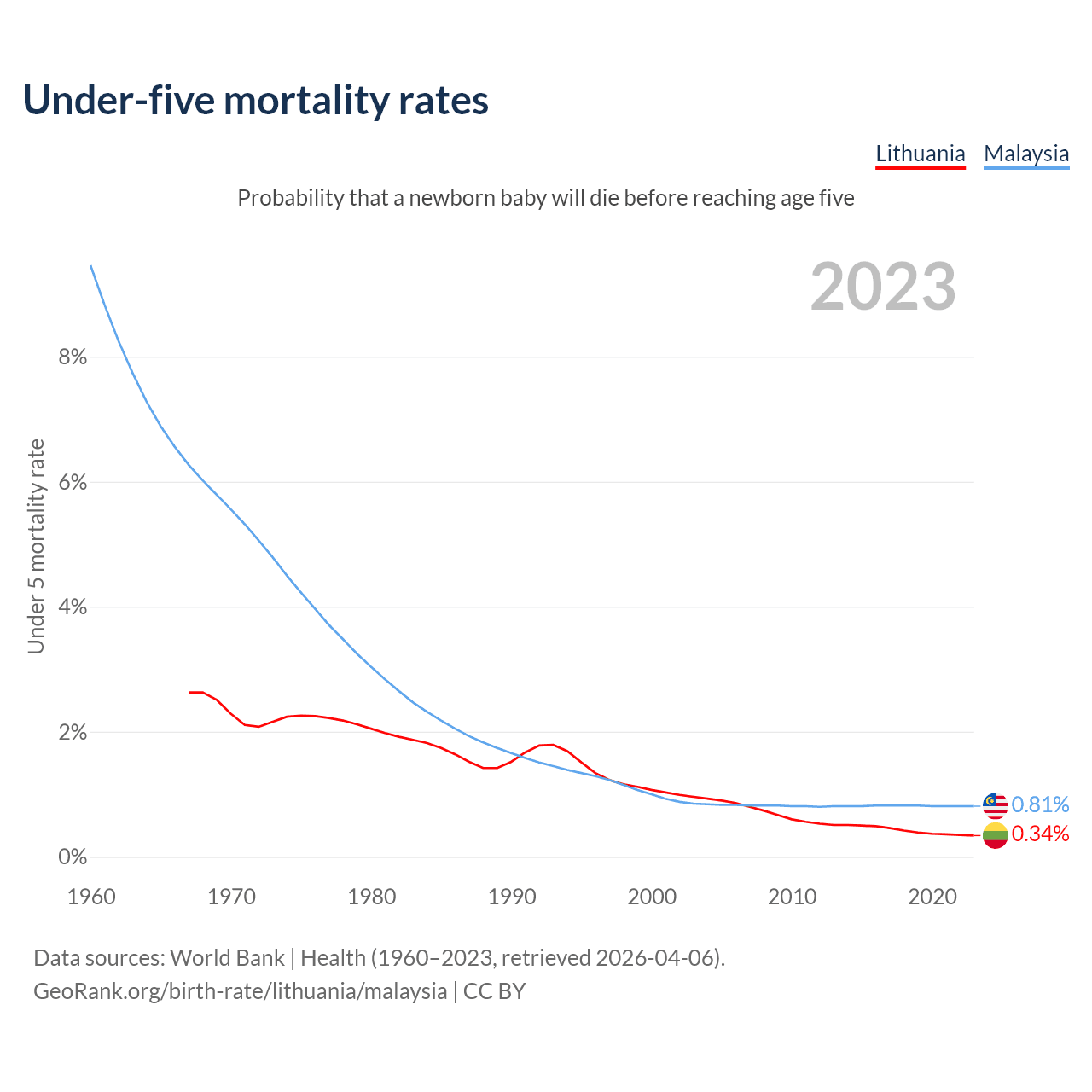 The chance that a newborn baby will die before reaching age five is 0.34% in Lithuania and 0.81% in Malaysia. Above is a chart with historical data on under-five mortality rates.
