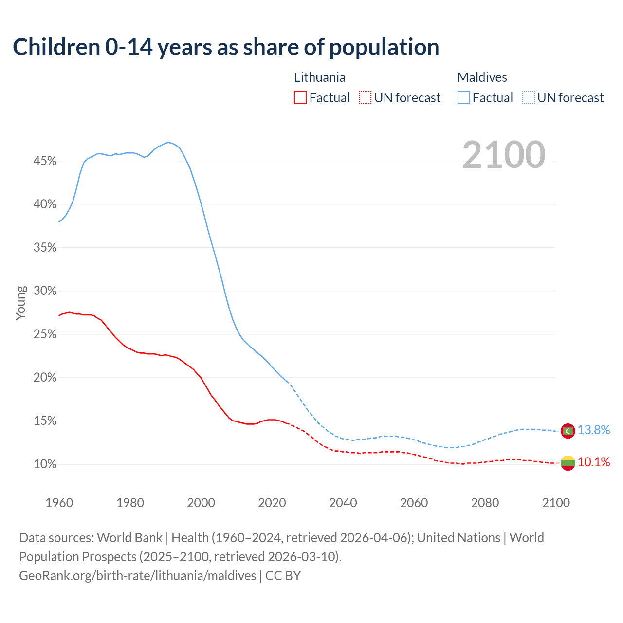 According to the latest available data on birth rates, the fertility rate in Lithuania was 1.18 children per woman in 2023, compared to 1.58 in Maldives in 2023. The replacement level is considered to be 2.1 children per woman.