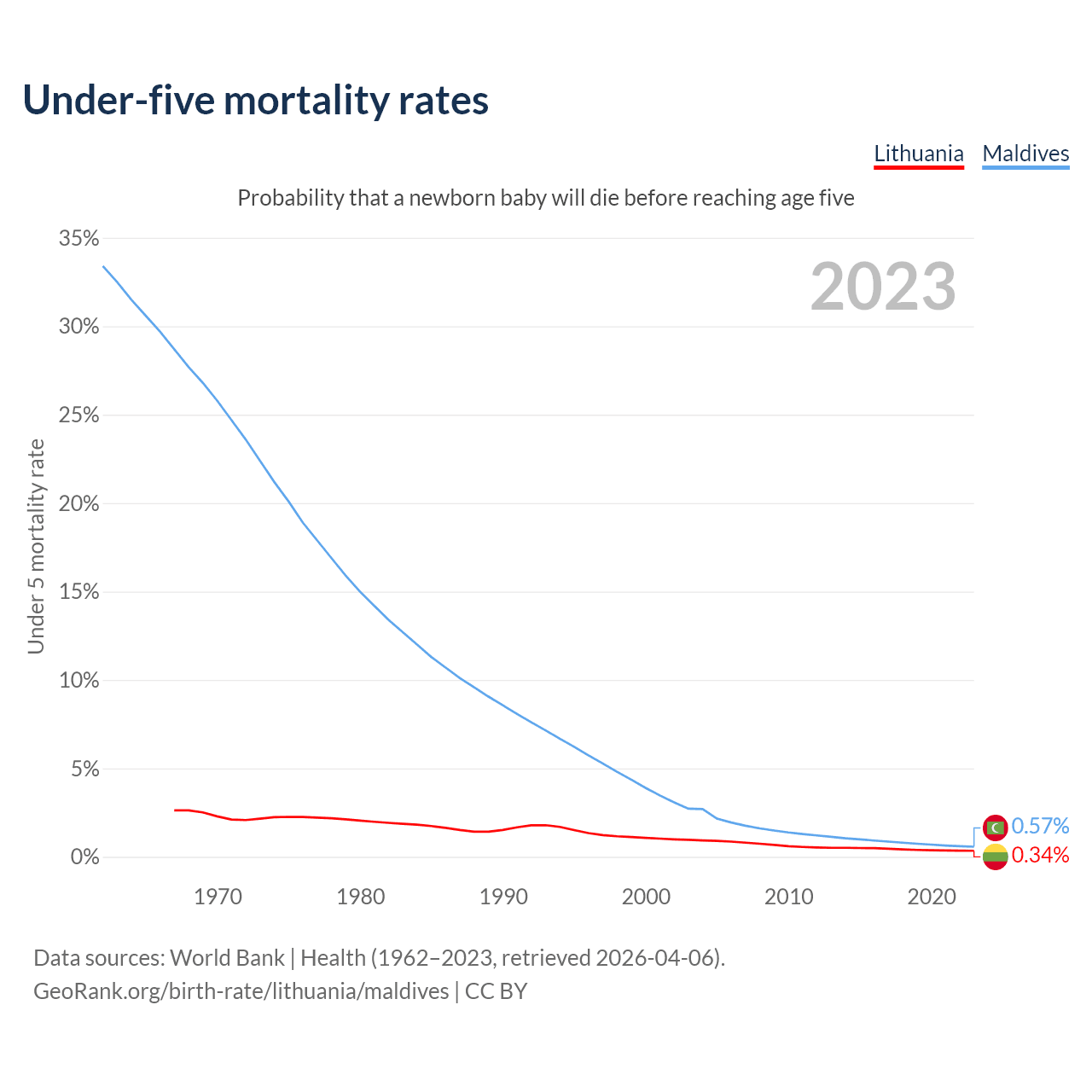 The chance that a newborn baby will die before reaching age five is 0.34% in Lithuania and 0.57% in Maldives. Above is a chart with historical data on under-five mortality rates.