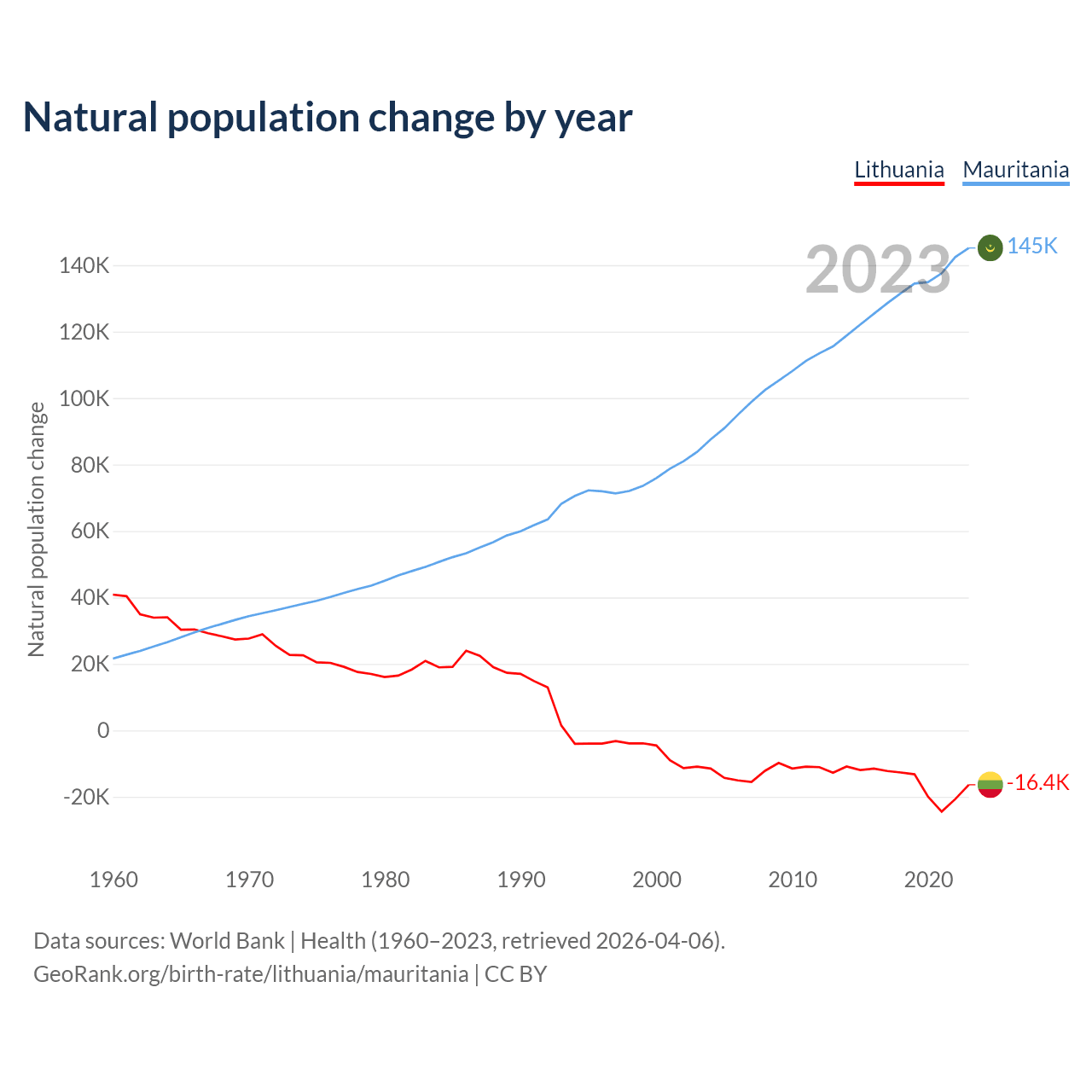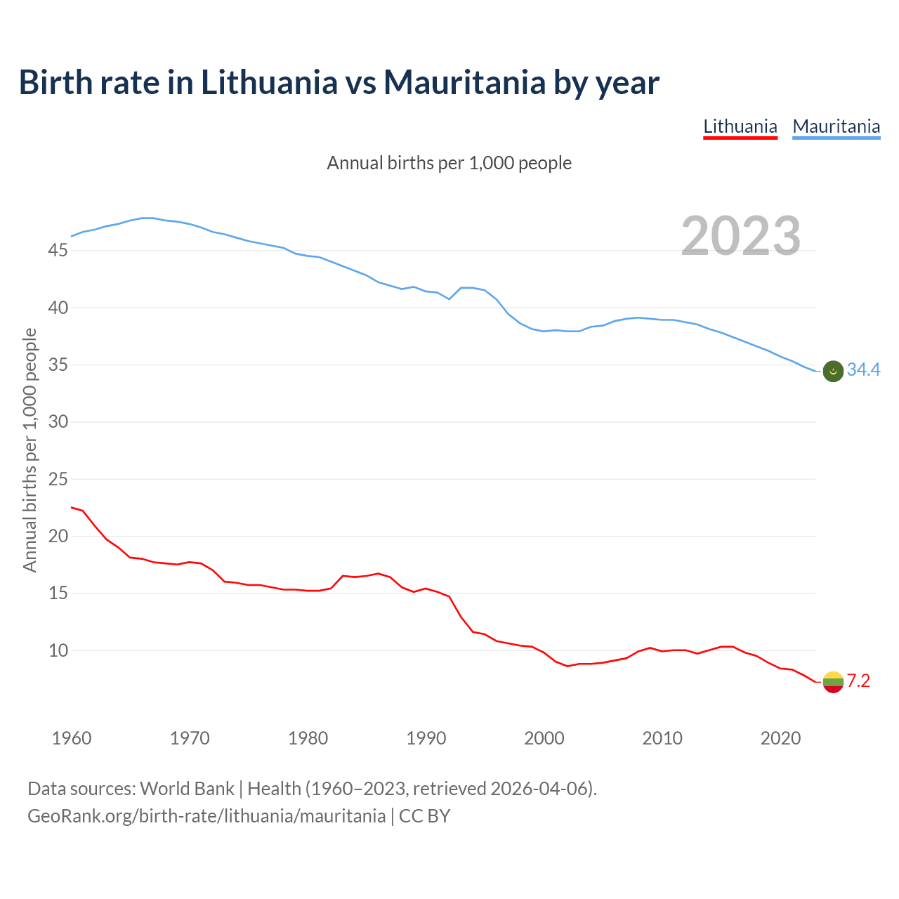 Lithuania has an annual birth rate of 7.2 births per 1,000 people, compared to 34.4 for Mauritania. The average number of children a woman is expected to have during her lifetime — the fertility rate, is 1.18 in Lithuania and 4.7 in Mauritania — 298.1% difference.