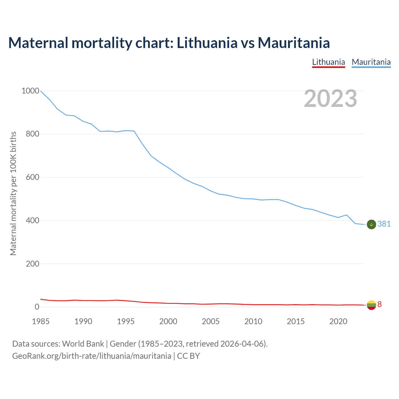 The maternal mortality rate, which is the probability of dying during childbirth or within 42 days of pregnancy termination, is 8 deaths per 100,000 live births in Lithuania, compared to 381 deaths in Mauritania.