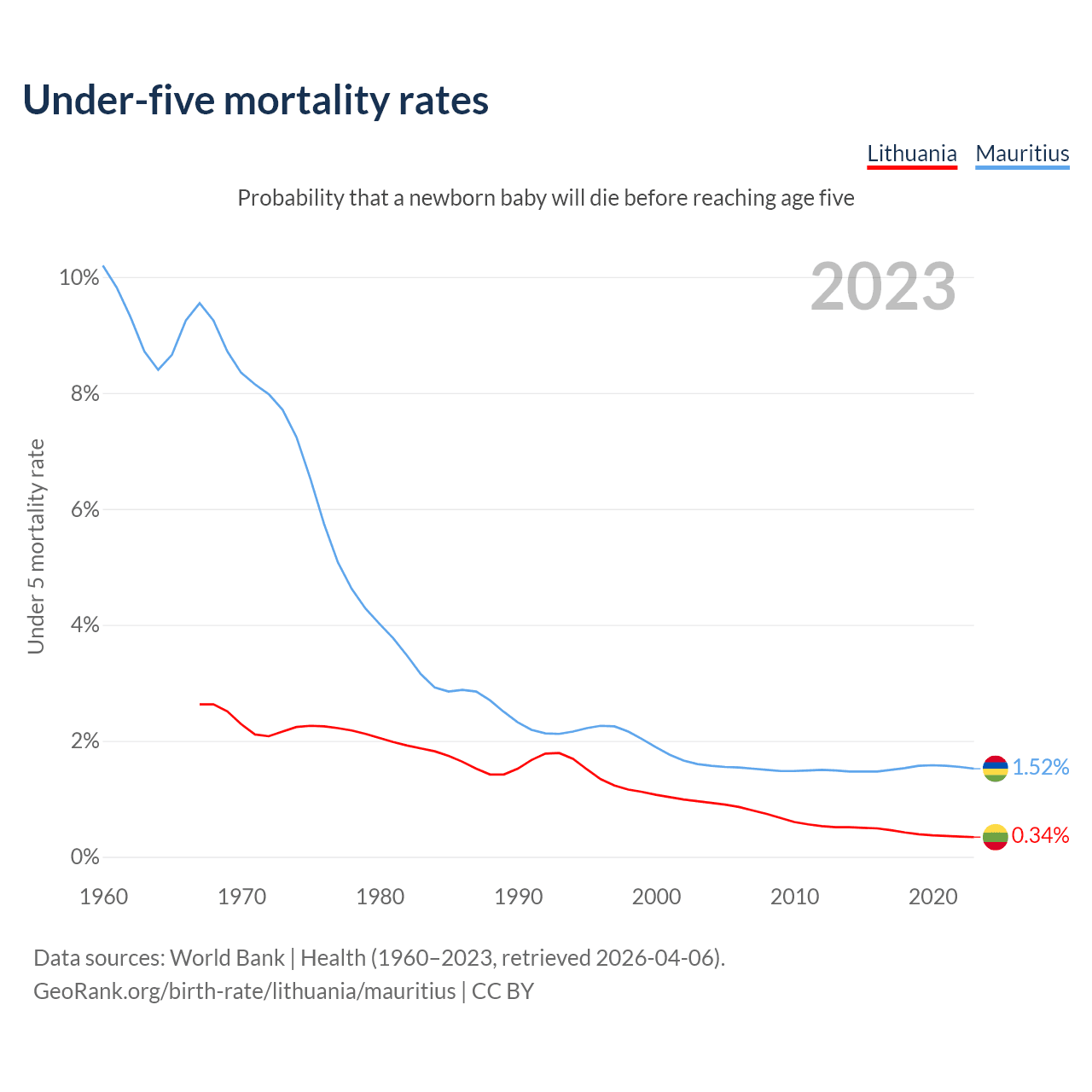 The chance that a newborn baby will die before reaching age five is 0.34% in Lithuania and 1.52% in Mauritius. Above is a chart with historical data on under-five mortality rates.