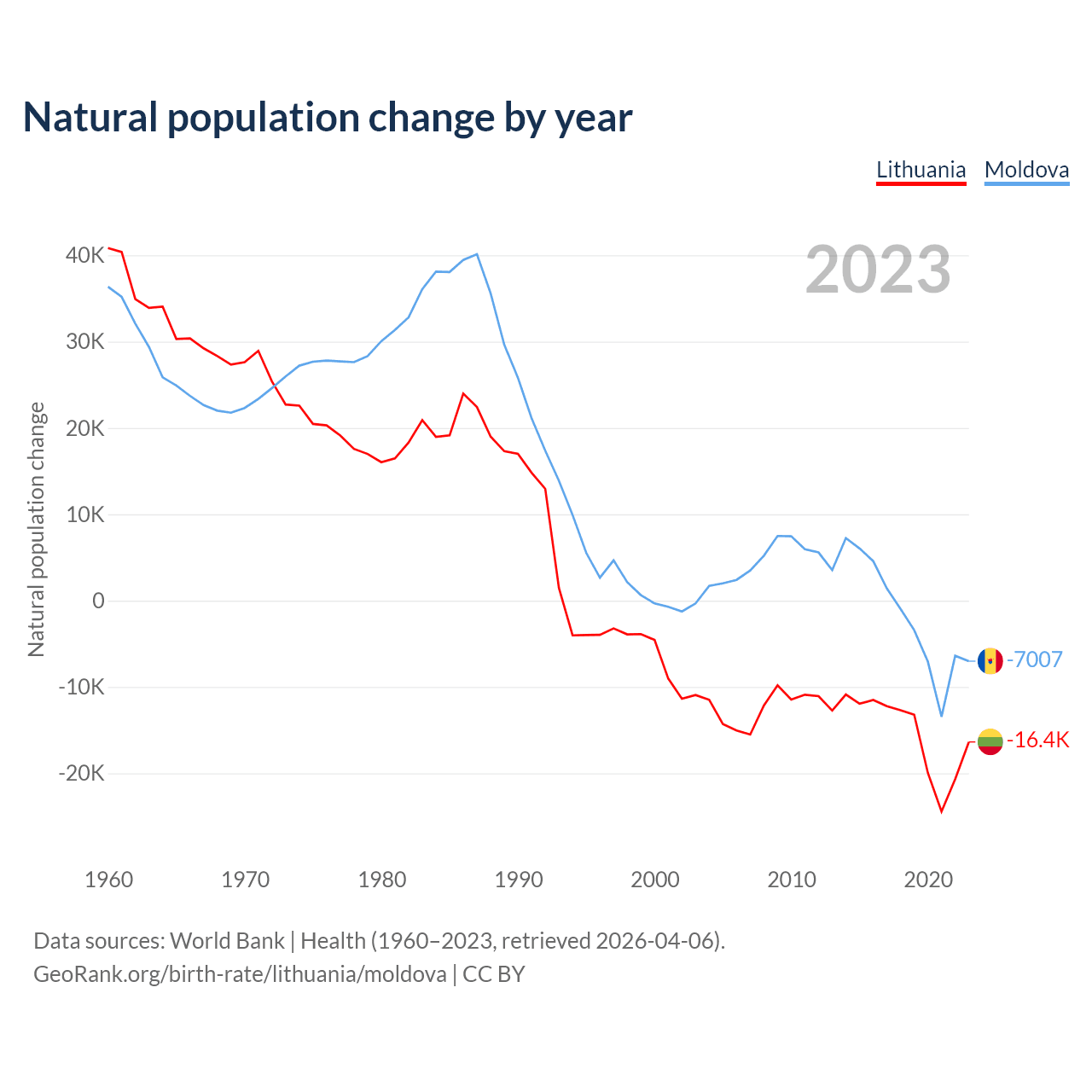 According to the latest available data on birth rates, the fertility rate in Lithuania was 1.18 children per woman in 2023, compared to 1.73 in Moldova in 2023. The replacement level is considered to be 2.1 children per woman.