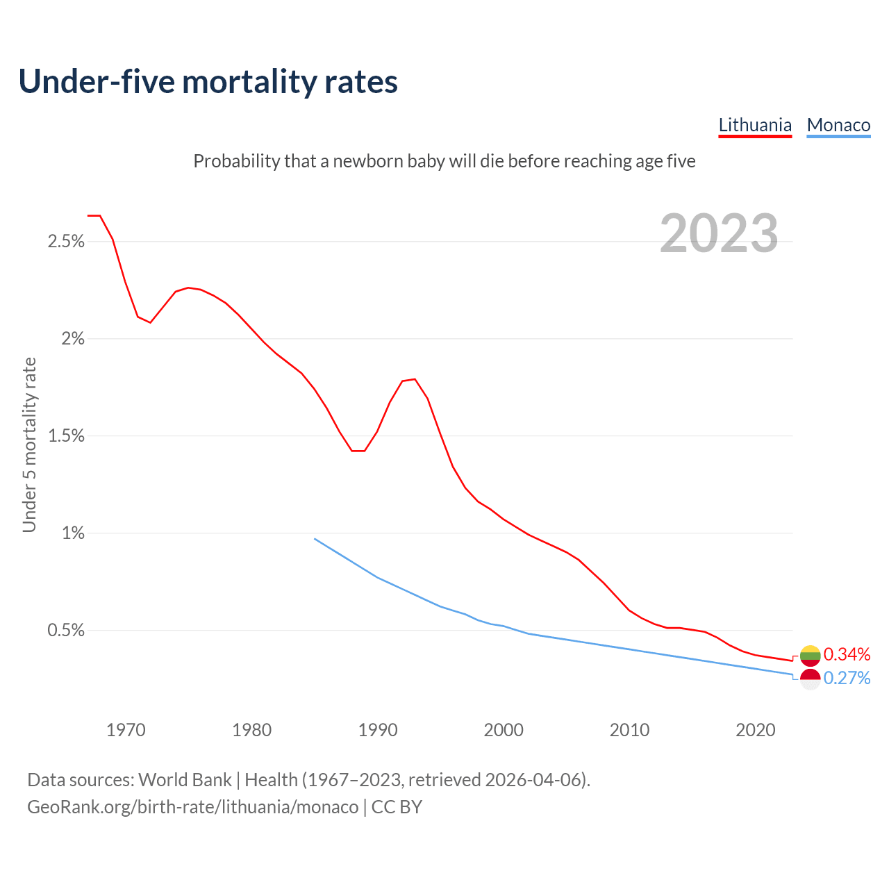 The chance that a newborn baby will die before reaching age five is 0.34% in Lithuania and 0.27% in Monaco. Above is a chart with historical data on under-five mortality rates.