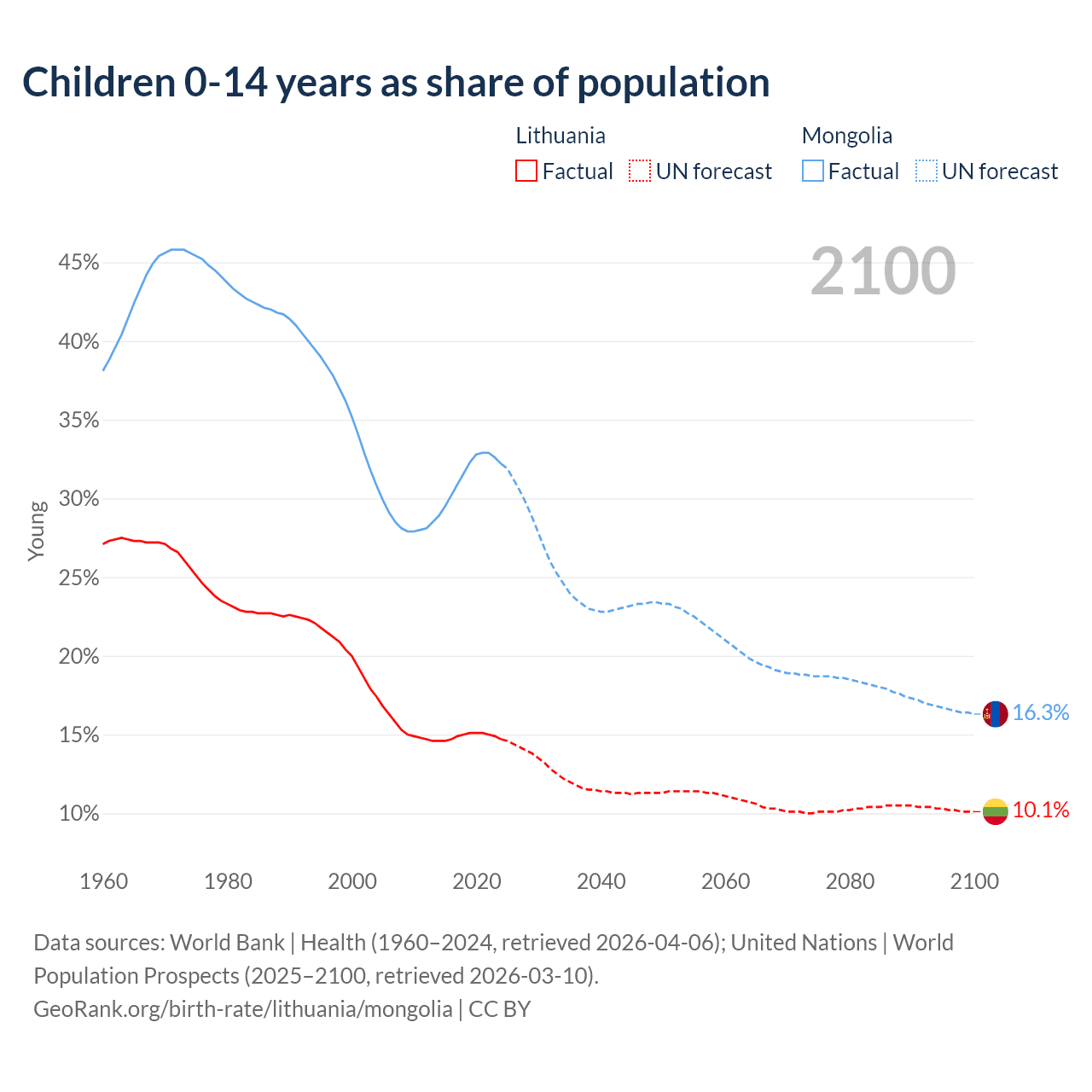 According to the latest available data on birth rates, the fertility rate in Lithuania was 1.18 children per woman in 2023, compared to 2.7 in Mongolia in 2023. The replacement level is considered to be 2.1 children per woman.