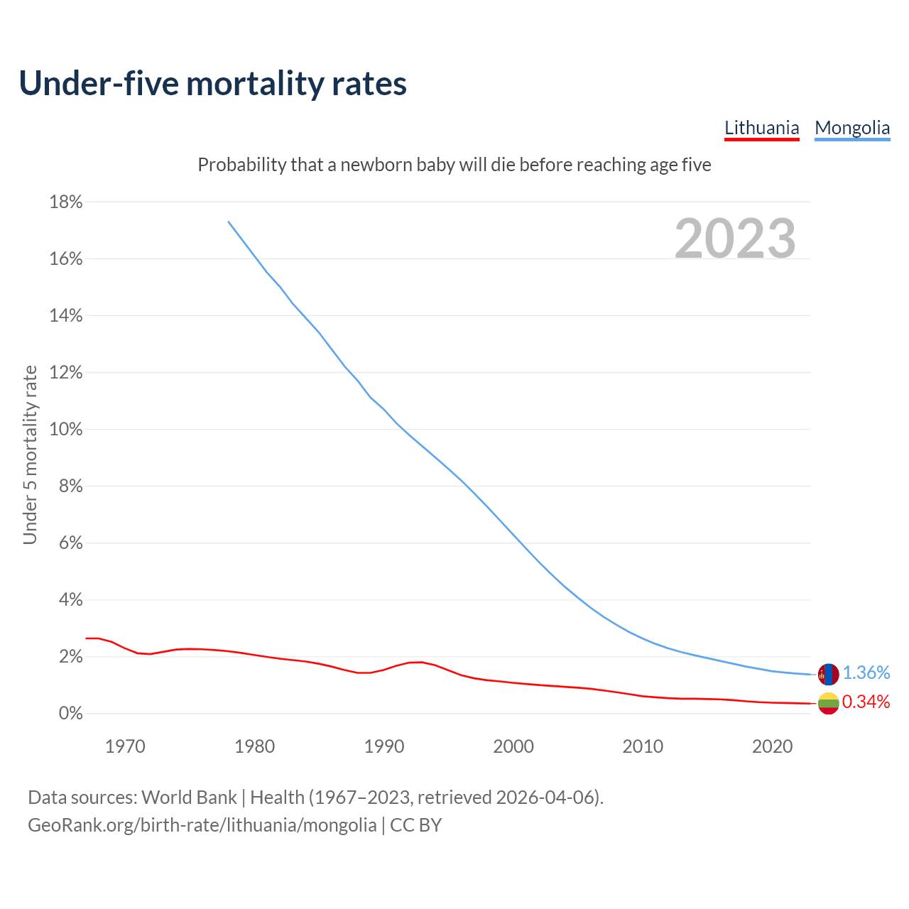 The chance that a newborn baby will die before reaching age five is 0.34% in Lithuania and 1.36% in Mongolia. Above is a chart with historical data on under-five mortality rates.