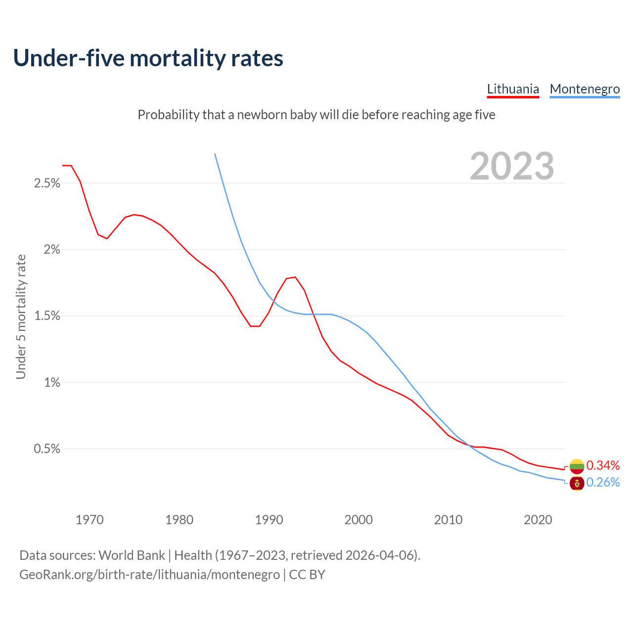 The chance that a newborn baby will die before reaching age five is 0.34% in Lithuania and 0.26% in Montenegro. Above is a chart with historical data on under-five mortality rates.