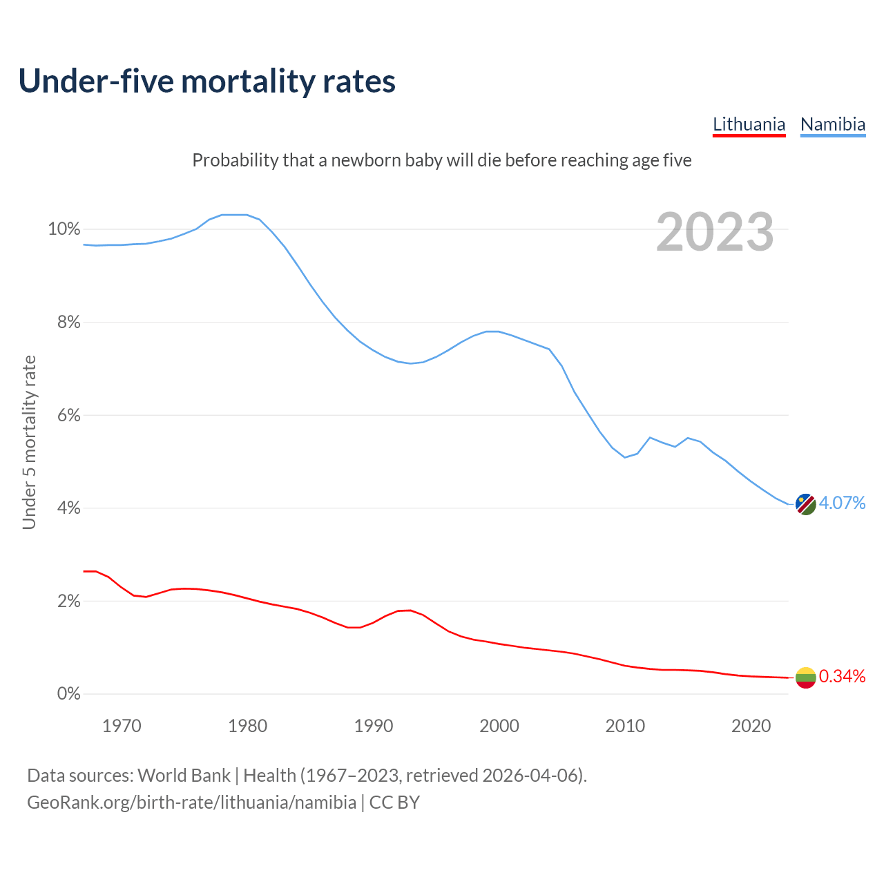 The chance that a newborn baby will die before reaching age five is 0.34% in Lithuania and 4.07% in Namibia. Above is a chart with historical data on under-five mortality rates.