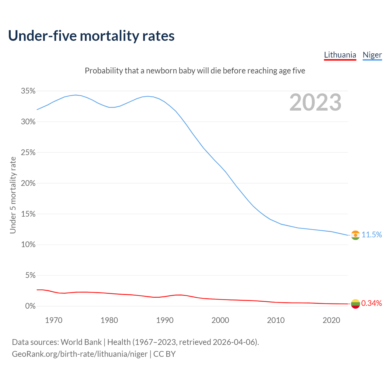 The chance that a newborn baby will die before reaching age five is 0.34% in Lithuania and 11.5% in Niger. Above is a chart with historical data on under-five mortality rates.