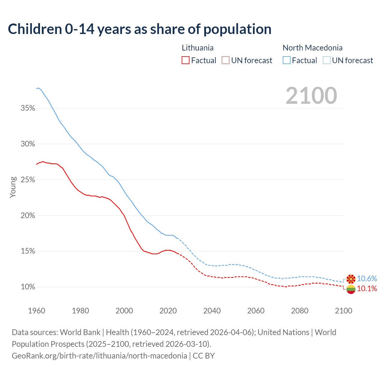 Lithuania has an annual birth rate of 7.2 births per 1,000 people, compared to 9.2 for North Macedonia. The average number of children a woman is expected to have during her lifetime — the fertility rate, is 1.18 in Lithuania and 1.5 in North Macedonia — 27.1% difference.