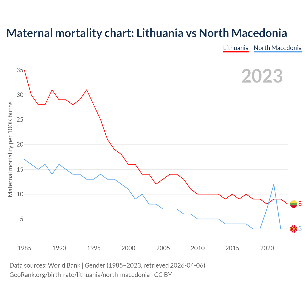 The maternal mortality rate, which is the probability of dying during childbirth or within 42 days of pregnancy termination, is 8 deaths per 100,000 live births in Lithuania, compared to 3 deaths in North Macedonia.