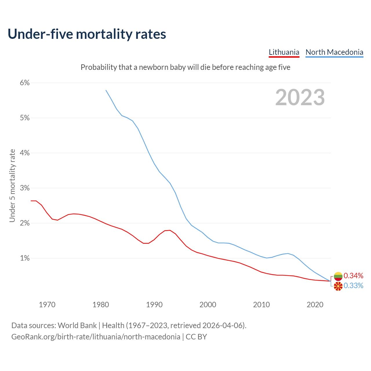 The chance that a newborn baby will die before reaching age five is 0.34% in Lithuania and 0.33% in North Macedonia. Above is a chart with historical data on under-five mortality rates.