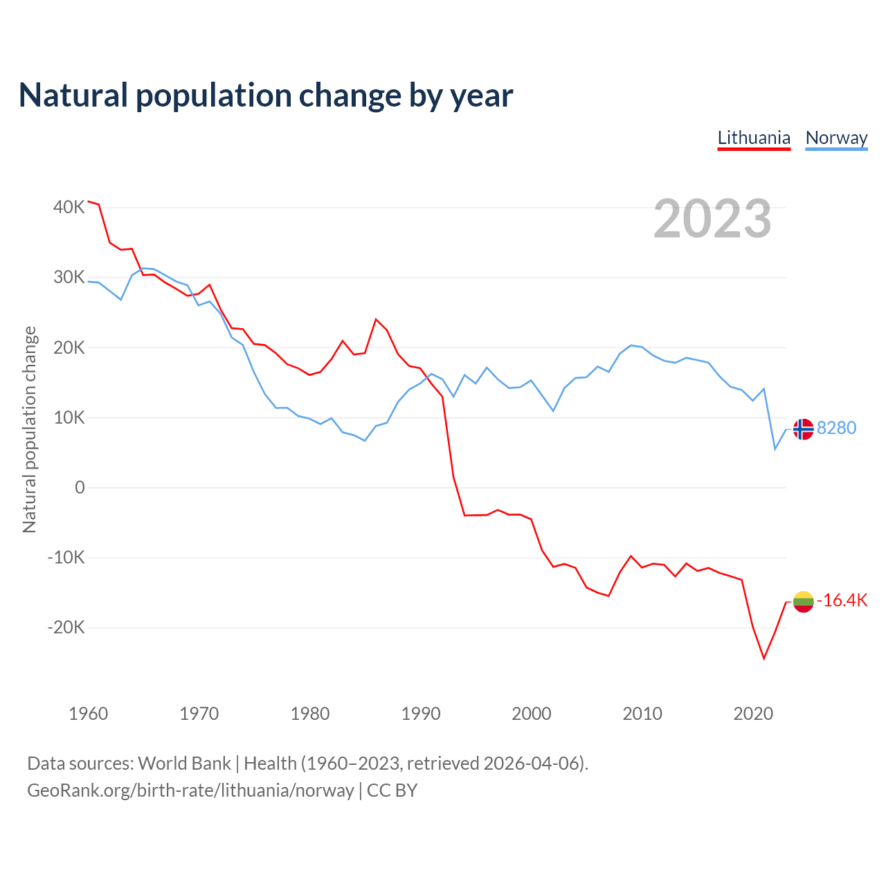 According to the latest available data on birth rates, the fertility rate in Lithuania was 1.18 children per woman in 2023, compared to 1.4 in Norway in 2023. The replacement level is considered to be 2.1 children per woman.