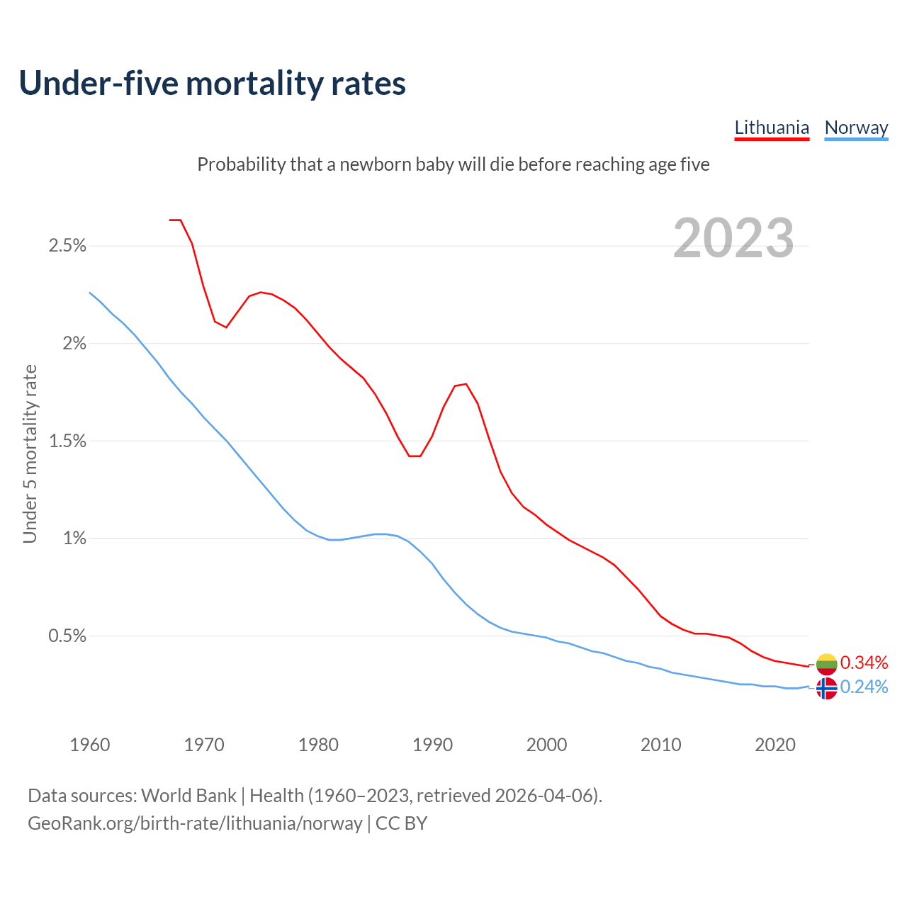 The chance that a newborn baby will die before reaching age five is 0.34% in Lithuania and 0.24% in Norway. Above is a chart with historical data on under-five mortality rates.