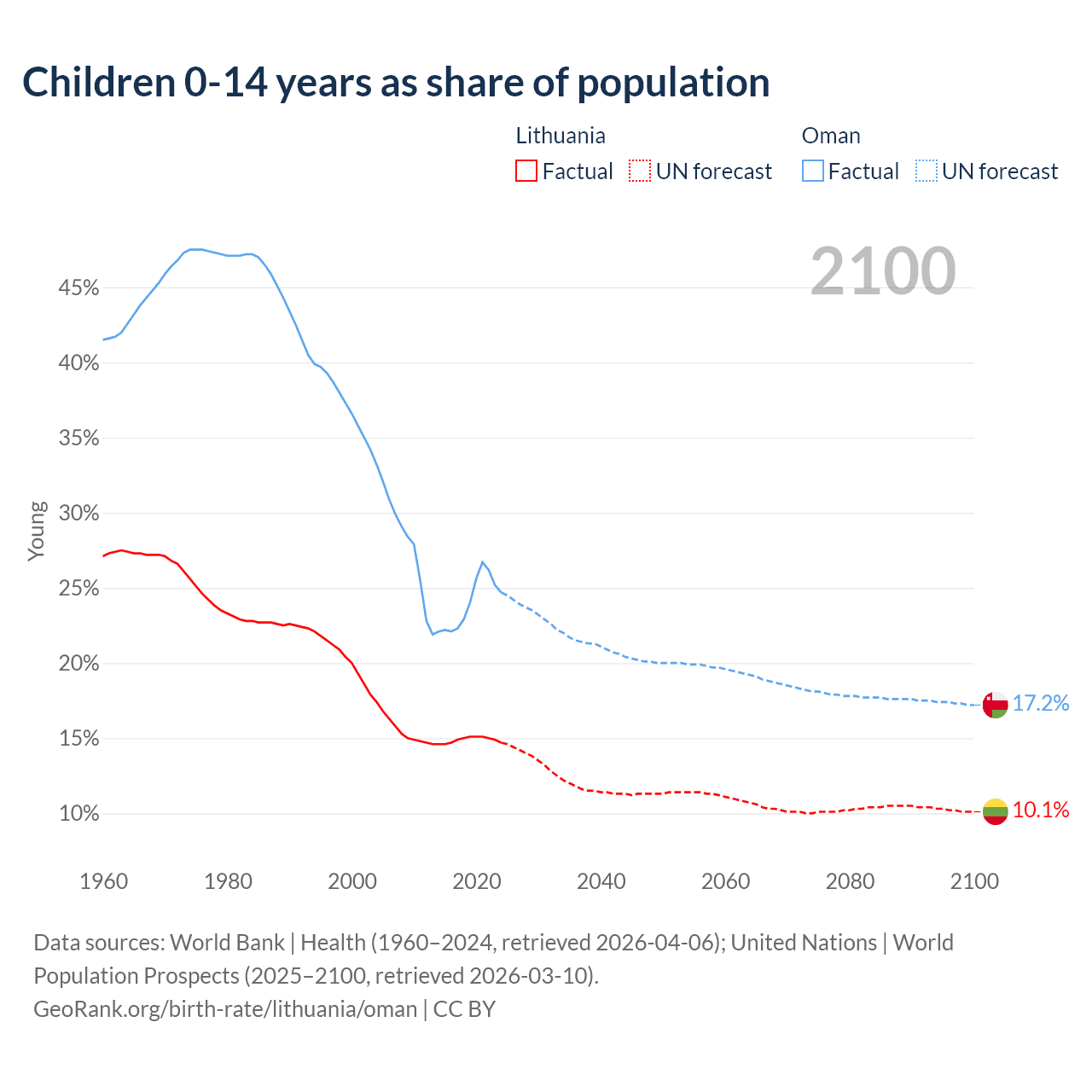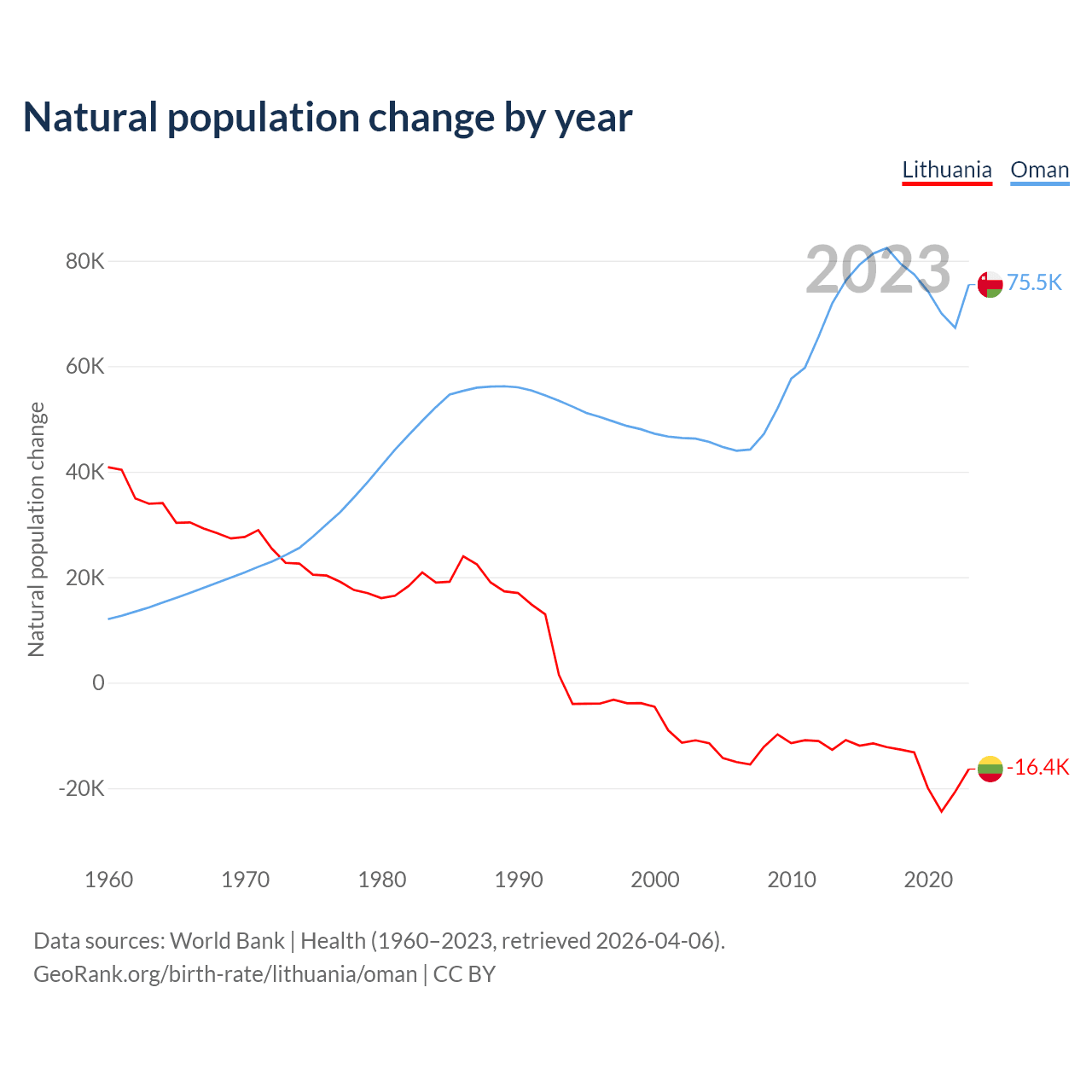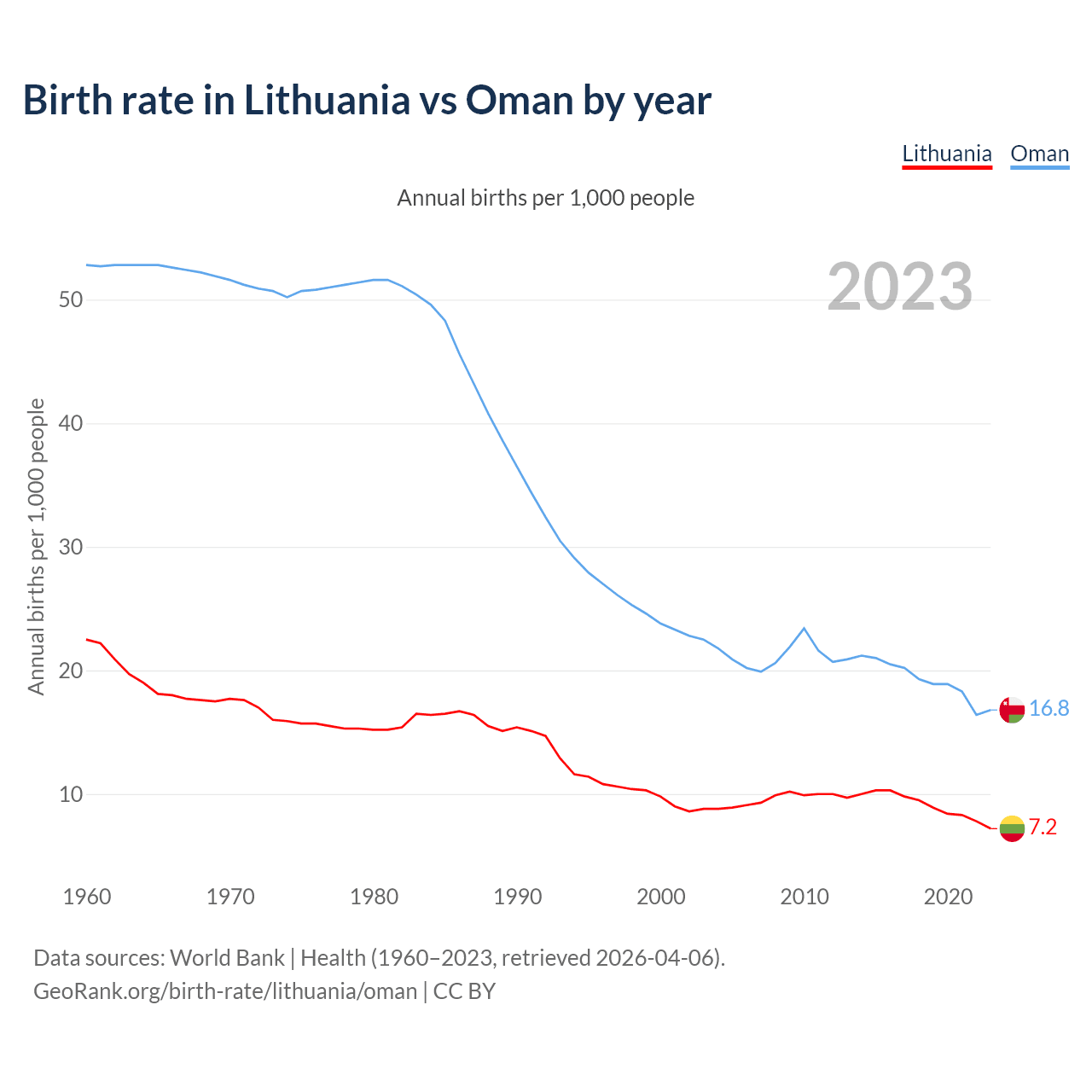 Lithuania has an annual birth rate of 7.2 births per 1,000 people, compared to 16.8 for Oman. The average number of children a woman is expected to have during her lifetime — the fertility rate, is 1.18 in Lithuania and 2.53 in Oman — 114% difference.