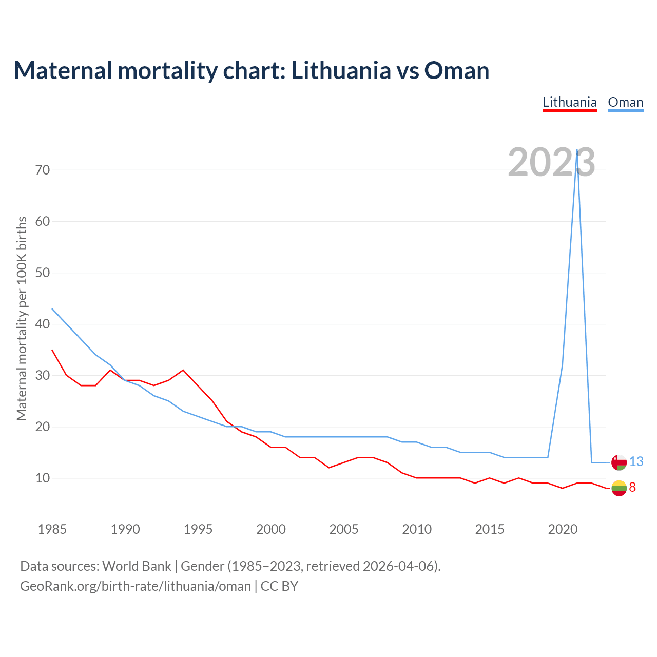 The maternal mortality rate, which is the probability of dying during childbirth or within 42 days of pregnancy termination, is 8 deaths per 100,000 live births in Lithuania, compared to 13 deaths in Oman.