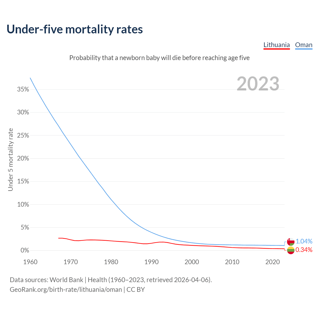 The chance that a newborn baby will die before reaching age five is 0.34% in Lithuania and 1.04% in Oman. Above is a chart with historical data on under-five mortality rates.
