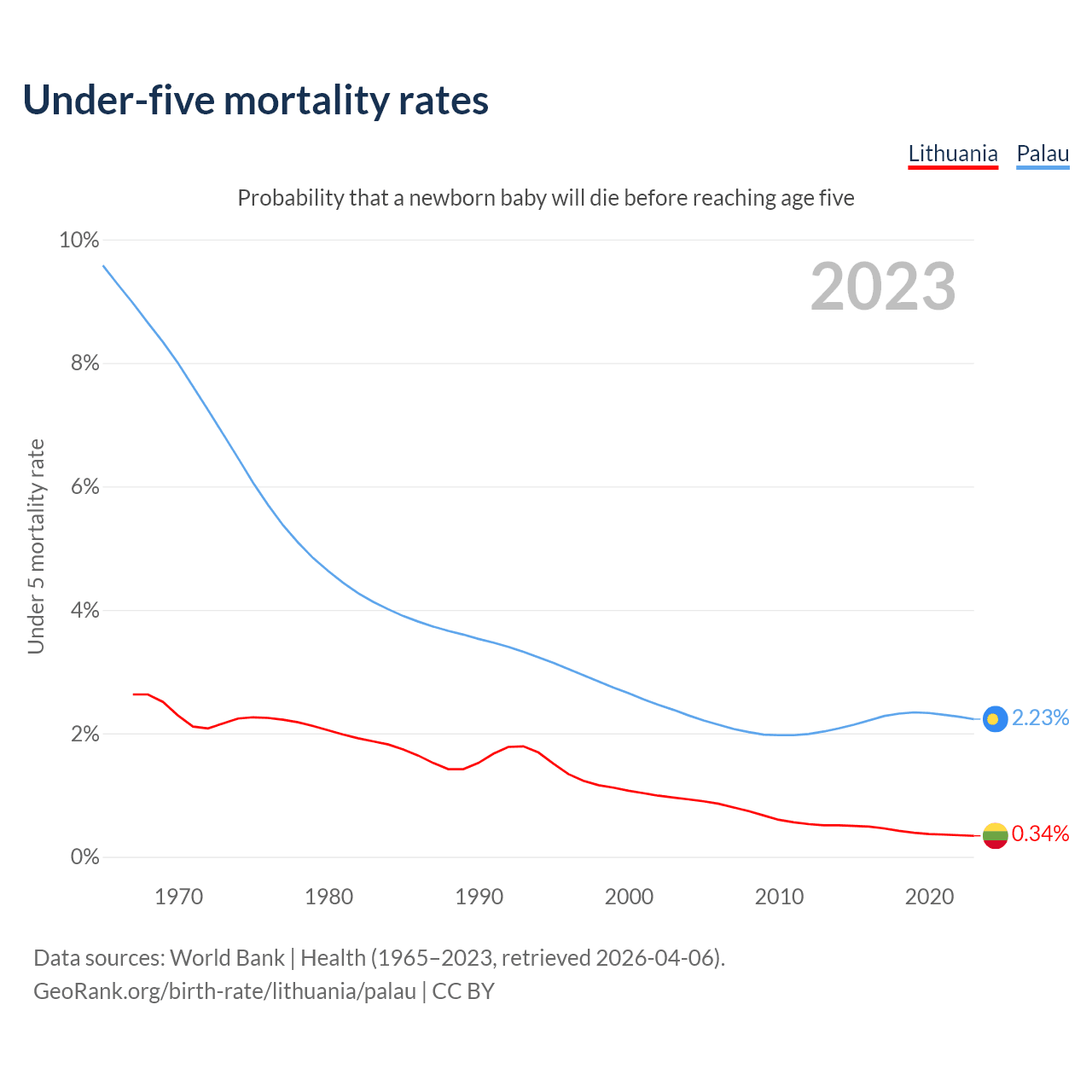 The chance that a newborn baby will die before reaching age five is 0.34% in Lithuania and 2.23% in Palau. Above is a chart with historical data on under-five mortality rates.