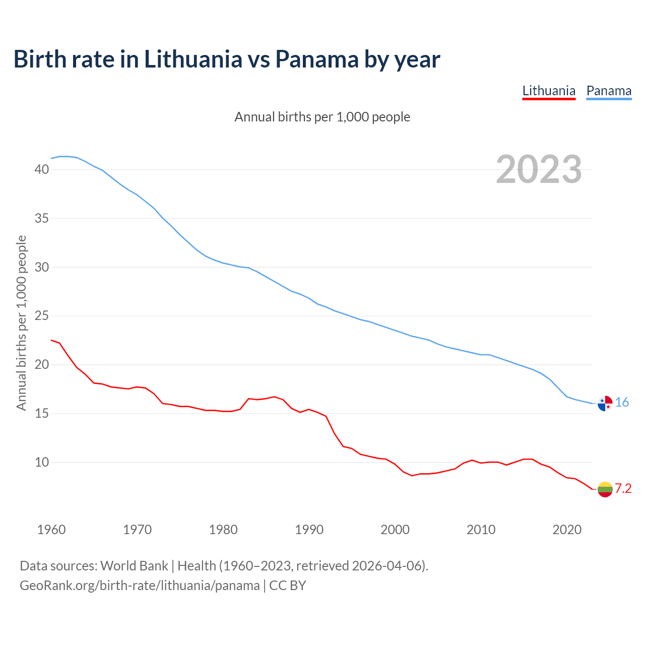Lithuania has an annual birth rate of 7.2 births per 1,000 people, compared to 16 for Panama. The average number of children a woman is expected to have during her lifetime — the fertility rate, is 1.18 in Lithuania and 2.12 in Panama — 79.6% difference.