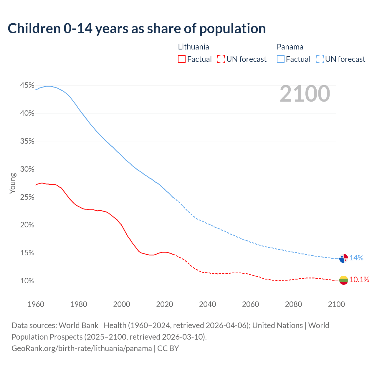 According to the latest available data on birth rates, the fertility rate in Lithuania was 1.18 children per woman in 2023, compared to 2.12 in Panama in 2023. The replacement level is considered to be 2.1 children per woman.